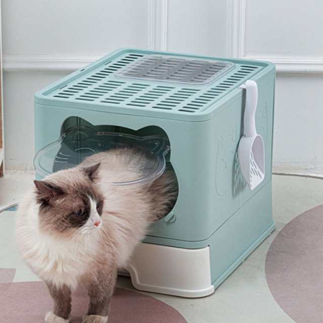 可愛いデザイン 猫砂飛び散り防止設計 引き出し式構造のトレーで手軽に砂をお掃除交換可能です 猫 トイレ 大きめ 大型 組み立て式 折りたたみ 折り畳み おしゃれ 上から 引き出し式 全4色 スコップ付き フルカバー システム かわいい 可愛い 猫トイレ