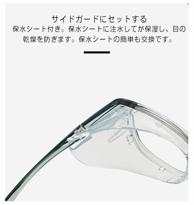 | 花粉対策・目の乾燥対策・ブルーライトカット・紫外線カット・曇り止めの多機能花粉症用メガネ。 ドライアイ対策に、保水シートタイプのメガネ! 全周カバー型で高い花粉カット効果を発揮し、つらい風・ホコリ・花粉などの侵入を防ぎます。 サイドガードにセットする保水シート付き。保水シートに注水してが保湿し、目の乾燥を防ぎます。保水シートの簡単も交換です。 かけるだけでブルーライトカット!スマホやパソコン疲れを軽減! マスクを併用しても曇りにくい防曇レンズを標準搭載。 紫外線99%以上カット。日常のほこりや黄砂、PM2.5対策にも効果があります。 フレームには弾力のあるTR90素材を使用。衝撃に強く柔軟性があり、ソフトにお顔を包み込んで締め付け感がありません。 ドライアイでお悩みの方はもちろん、花粉症の方にもおすすめです。 保水シートの装着方法 1、保水シートを取ります。 2、保水シートに注水器を押しつけ、少しずつ注水してください。 3、保水ポケットに保水シートをセットします。 | |