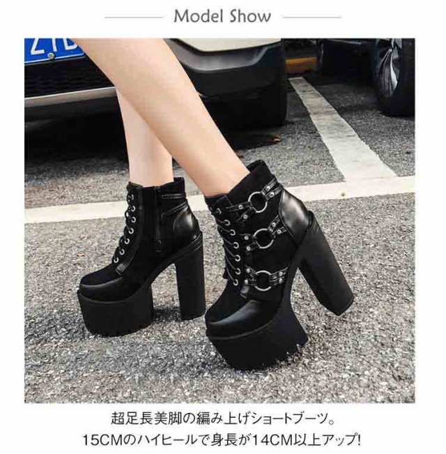 ブーティ ショートブーツ 厚底 15cmヒール レディース 編み上げ 太ヒール レースアップ ブーツ 美脚 厚底靴 コスプレ イベント 仮装 パーティー ハイヒール 舞台用 大きいサイズ 黒