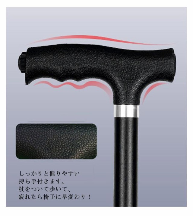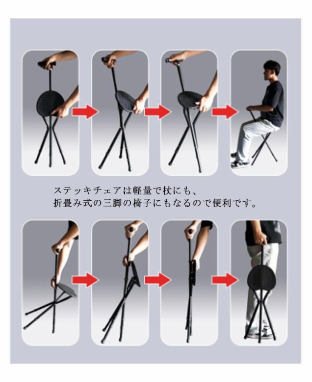 | 座れる!便利なステッキチェア。 ニーズに合わせて5段階調節可能! アルミステッキ本体は強くて軽く、安定して座れる、耐荷重性も抜群! しっかりと握りやすい持ち手付きます。 杖をついて歩いて、疲れたら椅子に早変わり! 座面を開くだけで簡単に椅子にする事ができます。 LEDライト付き、視界が悪い夜道にも便利。 ステッキチェアは軽量で杖にも、折畳み式の三脚の椅子にもなるので便利です。 ゴルフ・釣り・スポーツ観戦・行列待ちなどのちょいかけにおすすめです。 | |