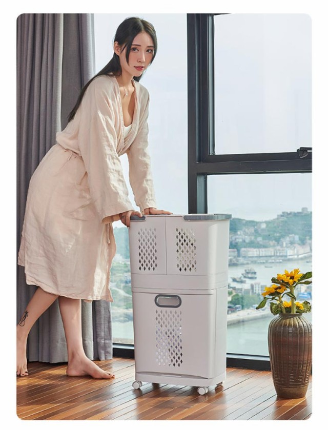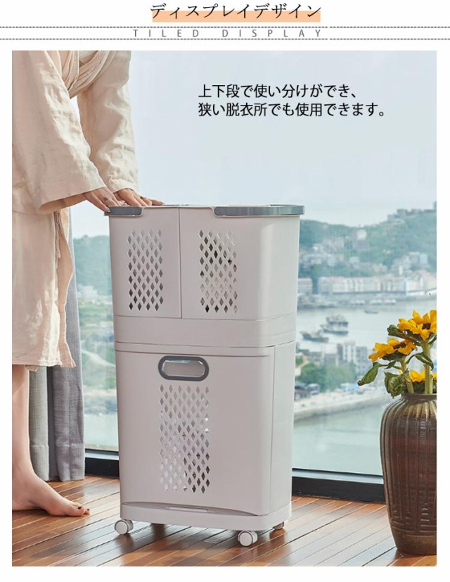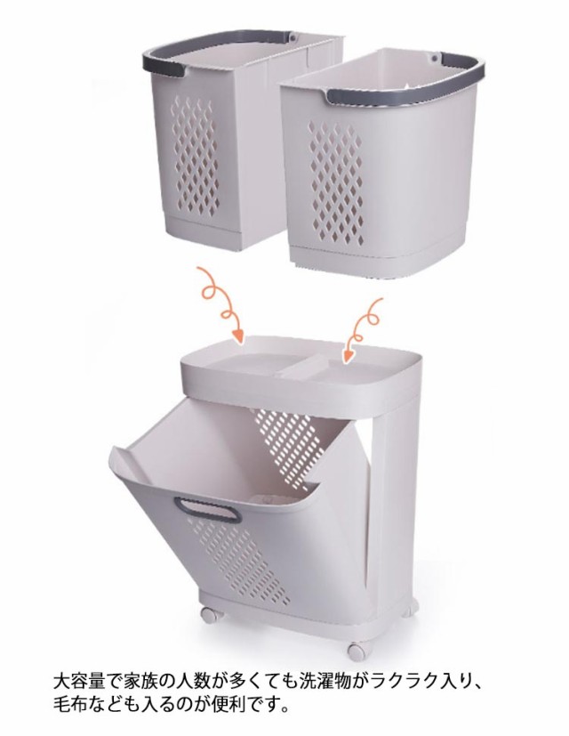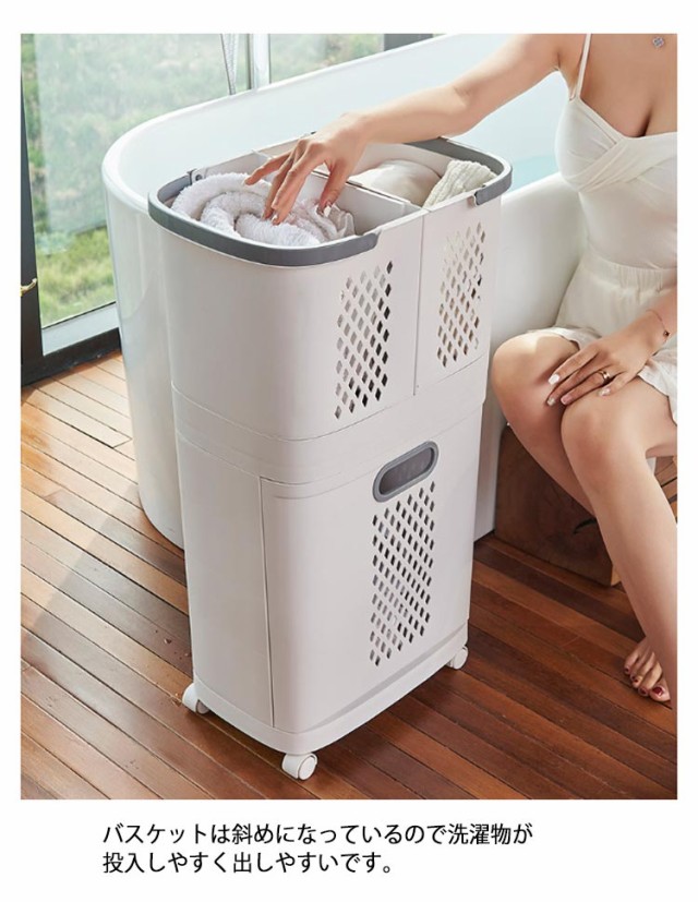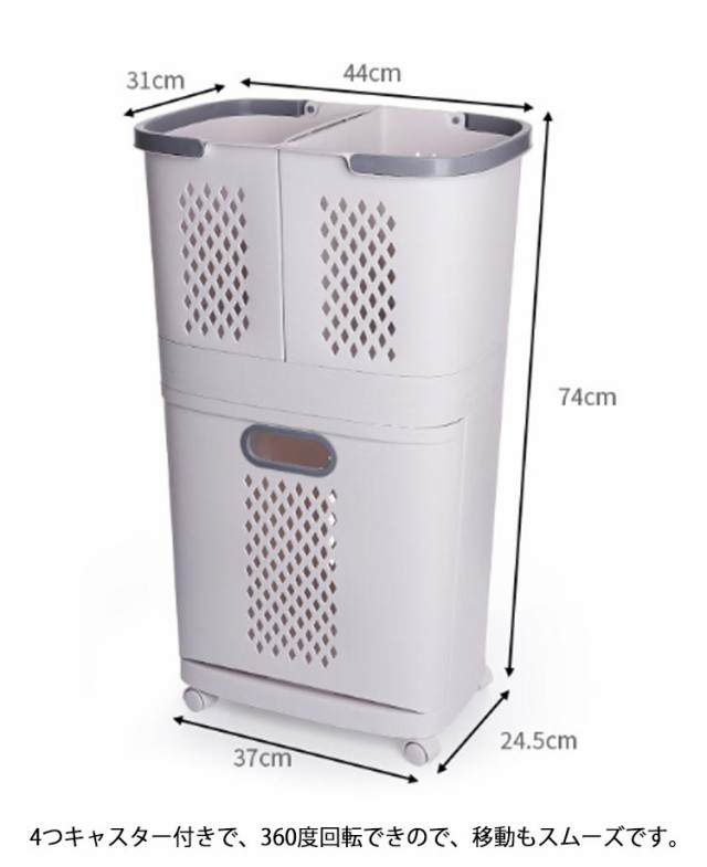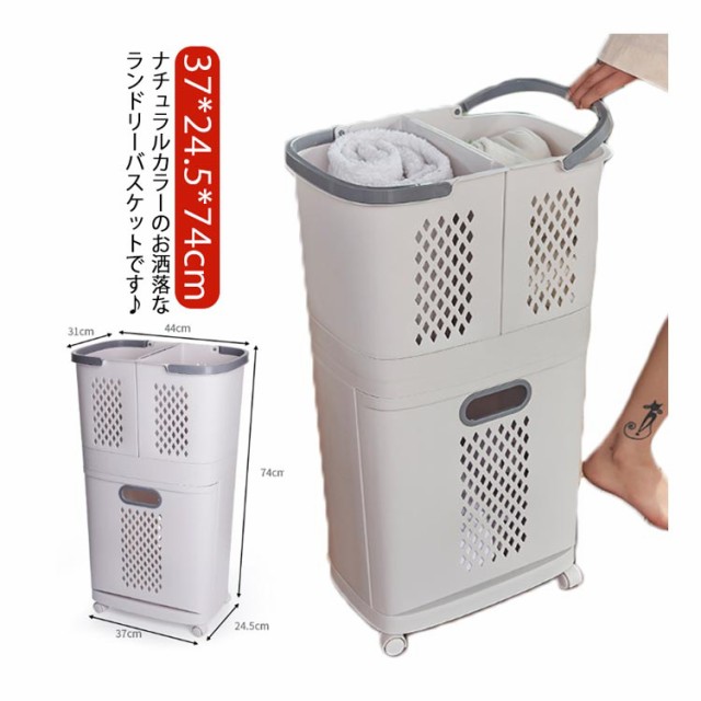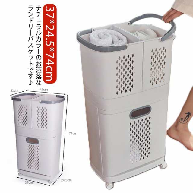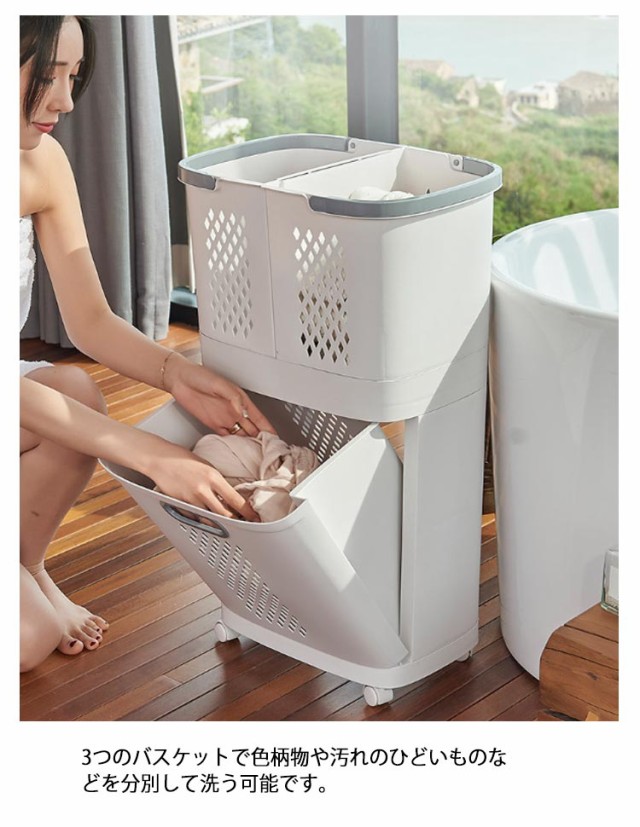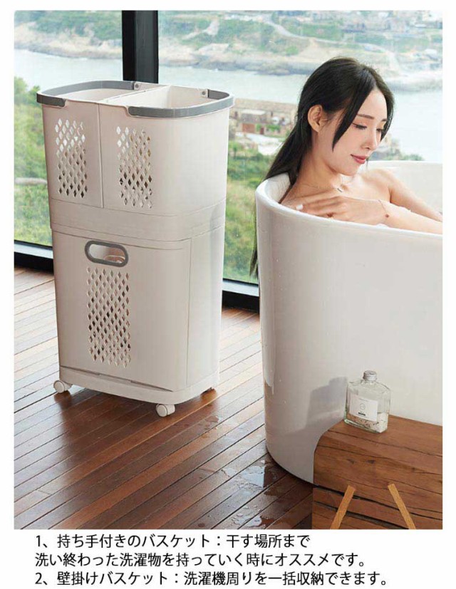 | ナチュラルカラーのお洒落なランドリーバスケットです♪ 上下段で使い分けができ、狭い脱衣所でも使用できます。 バスケットは斜めになっているので洗濯物が投入しやすく出しやすいです。 3つのバスケットで色柄物や汚れのひどいものなどを分別して洗う可能です。 4つキャスター付きで、360度回転できので、移動もスムーズです。 大容量で家族の人数が多くても洗濯物がラクラク入り、毛布なども入るのが便利です。 通気性も抜群で、湿気がこもらないのもメリットです。 【上段バスケット活用法】 1、持ち手付きのバスケット:干す場所まで洗い終わった洗濯物を持っていく時にオススメです。2、壁掛けバスケット:洗濯機周りを一括収納できます。 | |