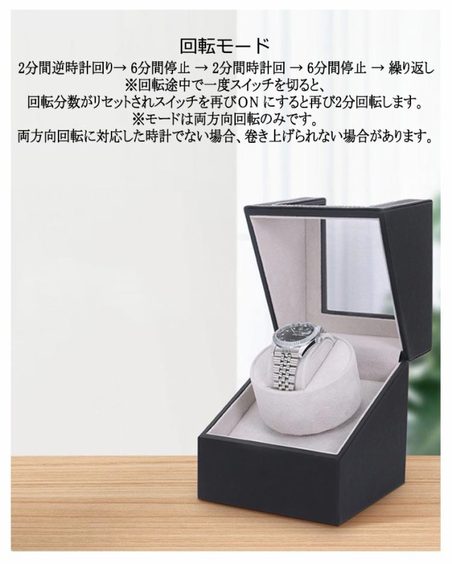 | サイズについての説明 | 12*13*15cm ※実寸はメジャー採寸の為、若干の誤差が生じる場合があります。 ●自動巻き上げ機 時計の磁化を防ぎ、収納するだけでなく、時計の性能もしっかりと守ります。 ●回転モード 2分間逆時計回り→ 6分間停止 → 2分間時計回 → 6分間停止 → 繰り返し ※回転途中で一度スイッチを切ると、回転分数がリセットされスイッチを再びОN にすると再び2分回転します。 ※モードは両方向回転のみです。両方向回転に対応した時計でない場合、卷き上げられない場合があります。 ●給電方法が2WAY選べる仕樣! 置く場所に合わせて選べる電源式と電池式の2way仕様です。 ●静音性に優れたモ一タ一を採用 寝室や書斎に置いても睡眠や作業の邪魔になりません。 ●機能とデザインの両立 コレクションしている時計を日常的に使いやすくしてくれる上、インテリアとしてもコレクションを綺麗にディスプレイしてくれます。 |