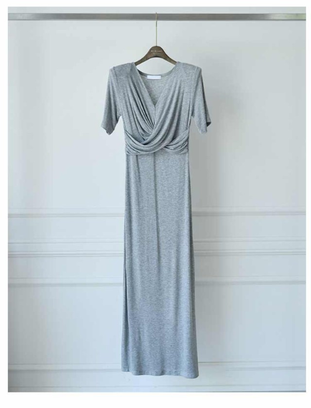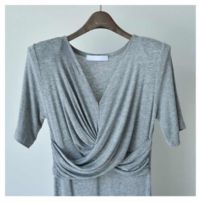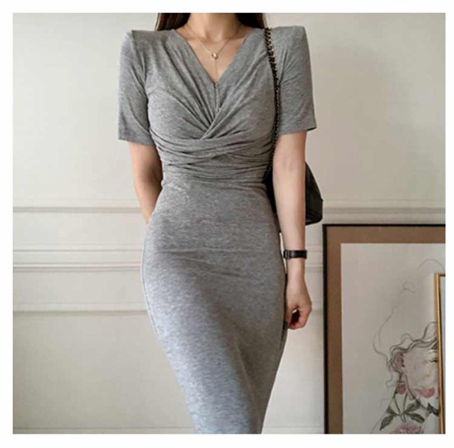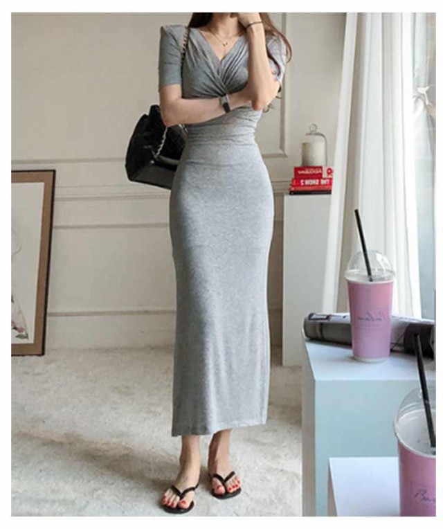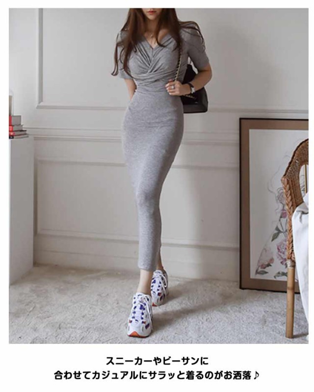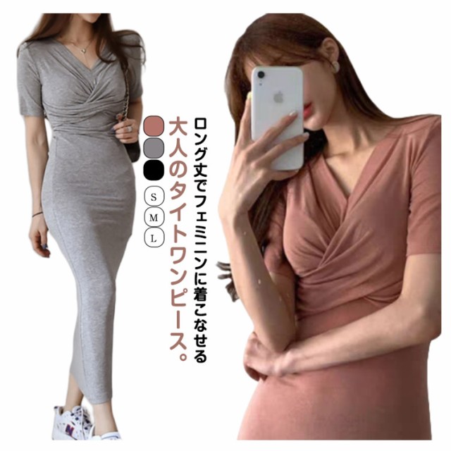 タイト ワンピース ロング丈ワンピース 半袖 春 夏 レディース ドレス ハイウエスト Vネック ミモレ丈 ワンピース Tシャツワンピ 着痩せ スリム ストレッチ おしゃれ ワンピース フェミニン フィット