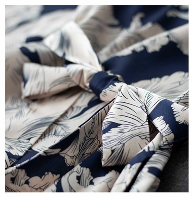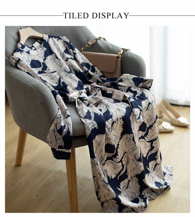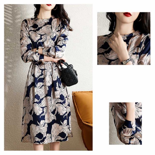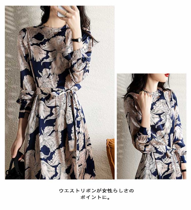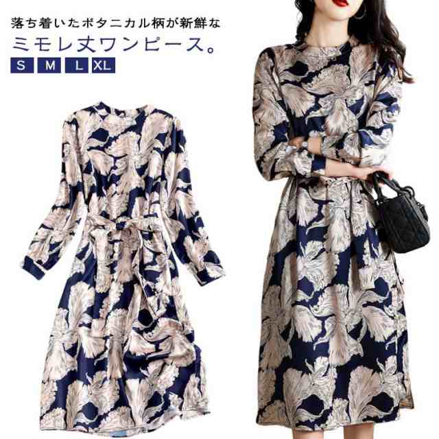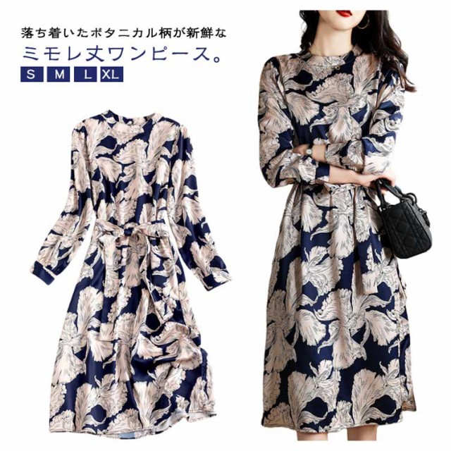 フェミニン エレガント ワンピース きれいめ レディース ワンピ ワンピース 長袖 ミモレ丈 おしゃれ 可愛い ブルー ボタニカル柄 ドレス ハイウエスト Aライン ウエストリボン 大きいサイズ 春 袖あり 秋 冬 20代 30代 40代