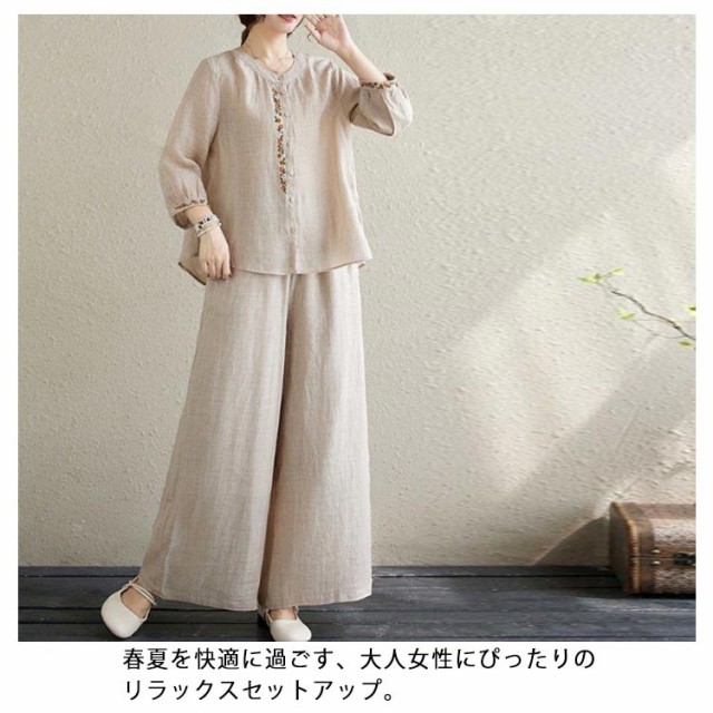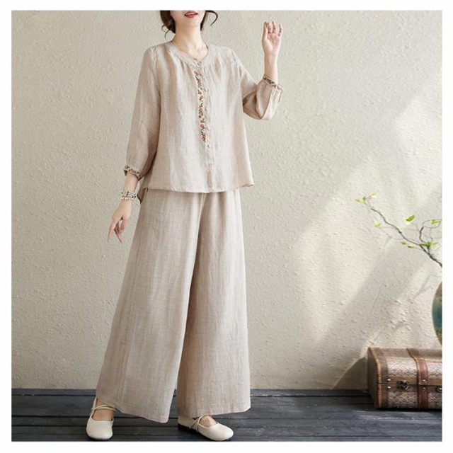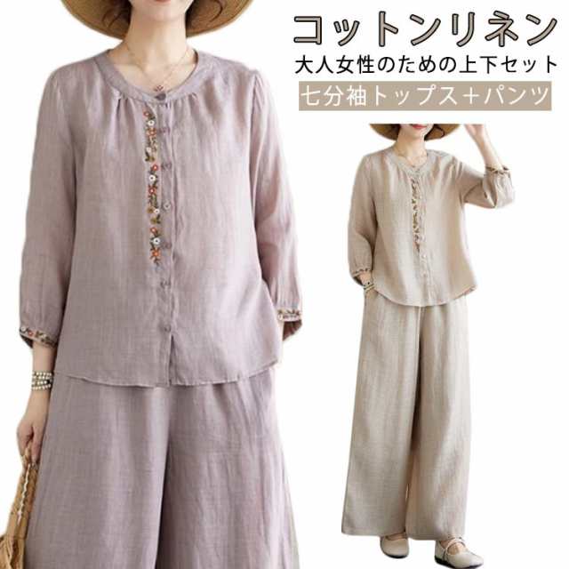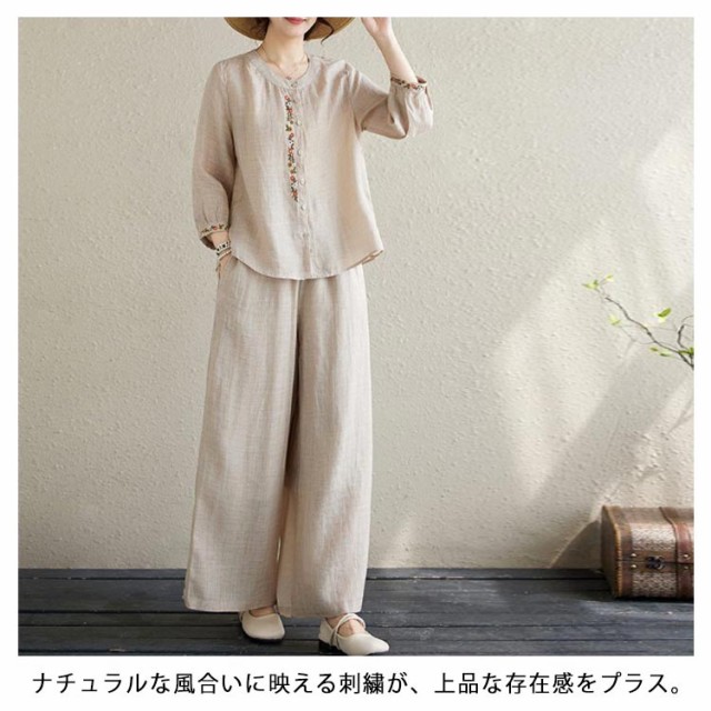 トップス ナチュラル 七分袖 チャイナ風 レディース セットアップ チャイナ風 刺繍 上下セット ロングパンツ 綿 コットン 通気性 体型カバー 大人女性 カジュアル お出かけ オフィス 春