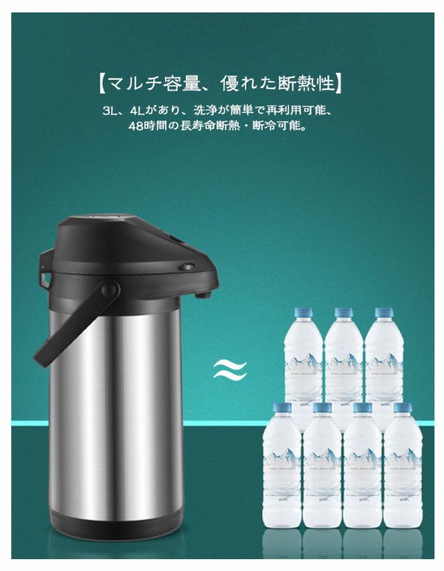 | 【2L】【保温保冷】 【304ステンレス】【安全ロック設計 】 【家庭の必需品】大容量、保温性が良い、使いやすい、破裂防止、安全設計、家庭での高齢者や子供、キャンプアウトのための必需品の選択です。 広口タイプなので、使いやすくお手入れも簡単なステンレスエアーポット。 【安全性を高めるマルチデザイン】ボタンを押すとお湯が押し出されるので、不安定な吹きこぼれでやけどをする心配がありません。 また、お子様が誤って開けてしまわないよう、チャイルドセーフティロックも搭載し、ご両親にも安心してお使いいただけます。 また、マルチセーフティ設計により、お年寄りからお子様まで安心してお使いいただけます。 【ステンレス鋼】ステンレス製なので、よい材料、高力、高温抵抗、耐食性、錆つくこと容易でない安定した性能。 お子様がいるご家庭やキャンプに出かける際にも必需品です。 【マルチ容量、優れた断熱性】3L、4Lがあり、洗浄が簡単で再利用可能、48時間の長寿命断熱・断冷可能。 | |