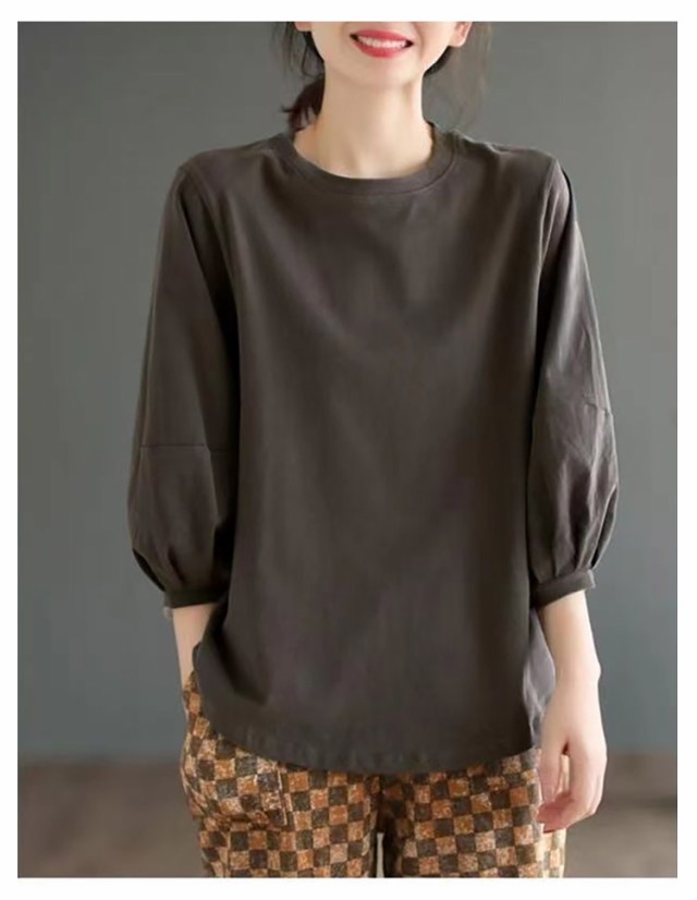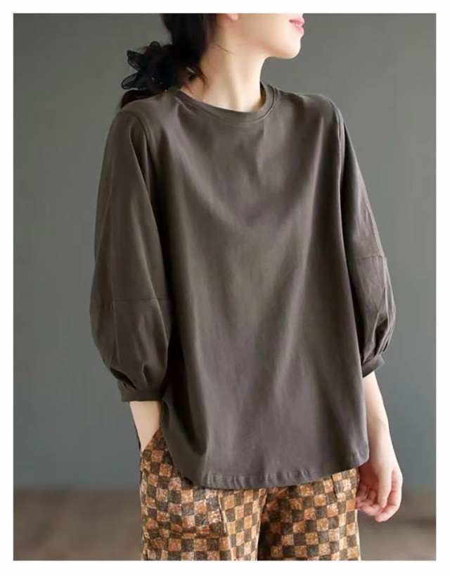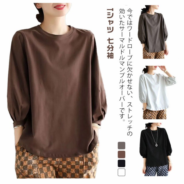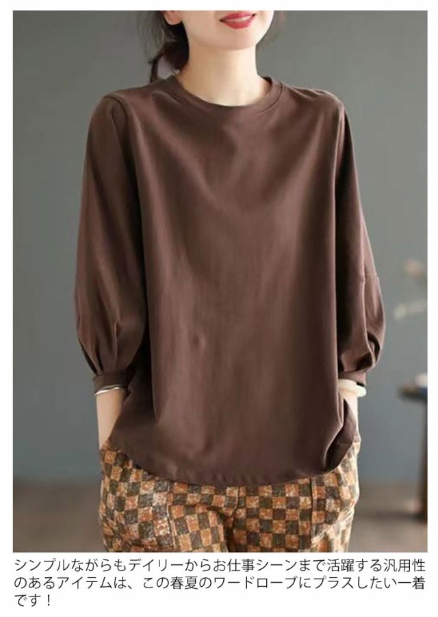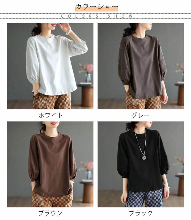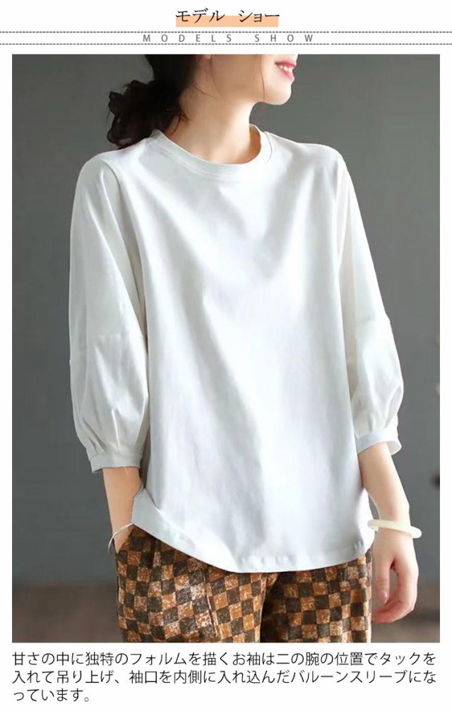 プルオーバー カットソー スウェット Tシャツ 七分袖 バルーンスリーブ レディース 大人 tシャツ トップス チュニック オーバーサイズ ゆったり ドルマンスリーブ ロンT 春 夏 オフィス カジュアル ビジネス 母 ママ ホワイト グレー ブラウン ブラック