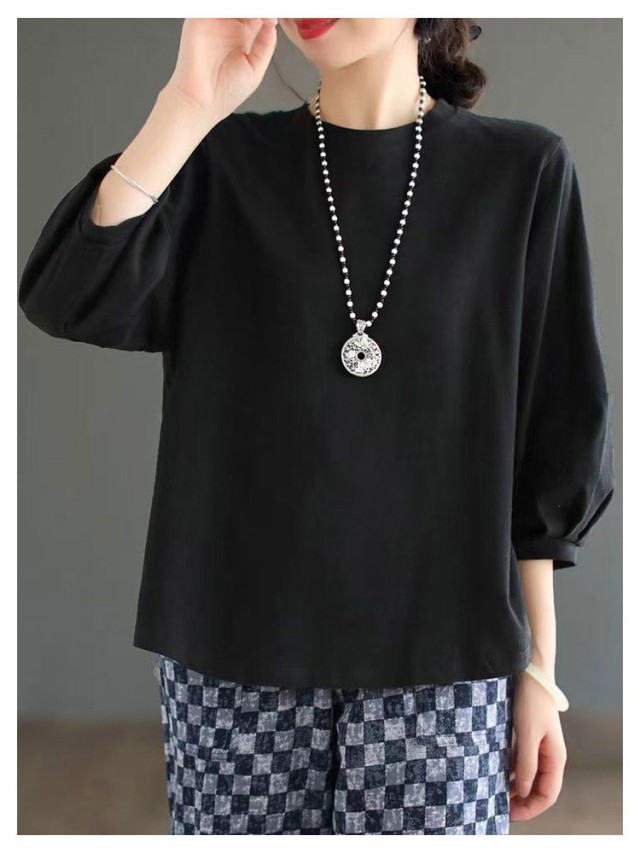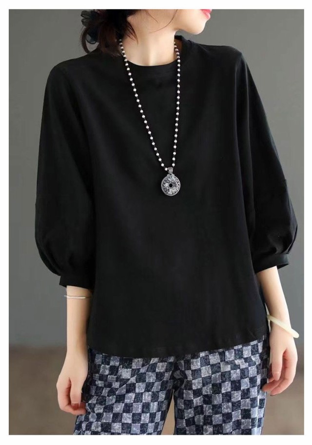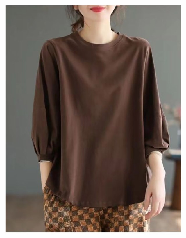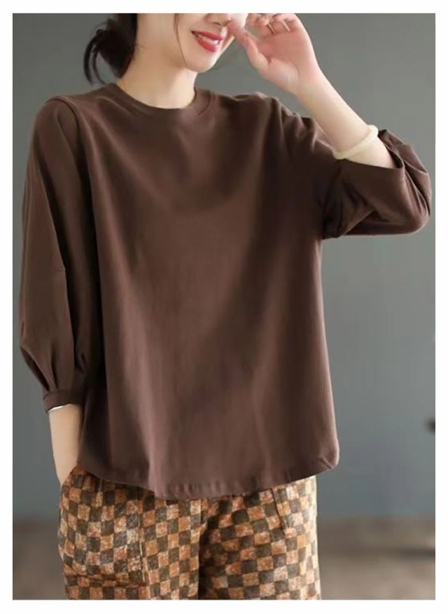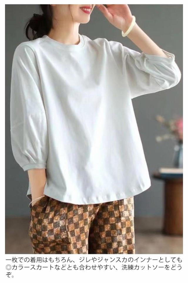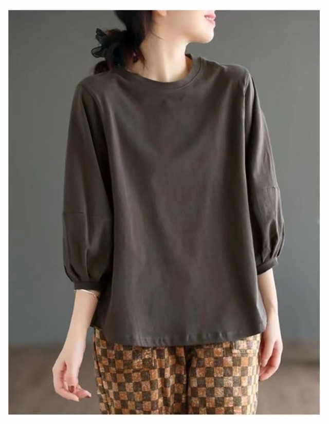 プルオーバー カットソー スウェット Tシャツ 七分袖 バルーンスリーブ レディース 大人 tシャツ トップス チュニック オーバーサイズ ゆったり ドルマンスリーブ ロンT 春 夏 オフィス カジュアル ビジネス 母 ママ ホワイト グレー ブラウン ブラック