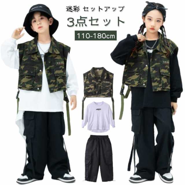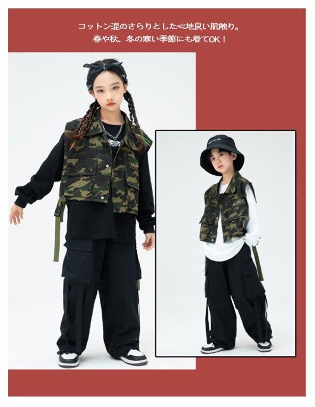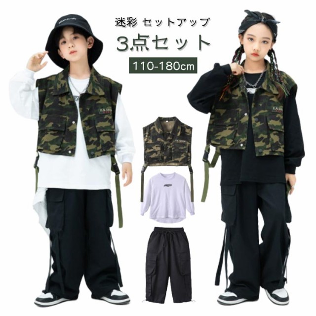 迷彩 ジャズダンス キッズ ダンス衣装 衣装 パンツ ベスト 迷彩 ステージ衣装 tシャツ セットアップ キッズ ロンパン 3点セット 男の子 K-POP かっこいい ヒップホップ ダンスウェア B系 hiphop jazz ダンス 迷彩 発表会 演出服 文化祭 応援団 黒