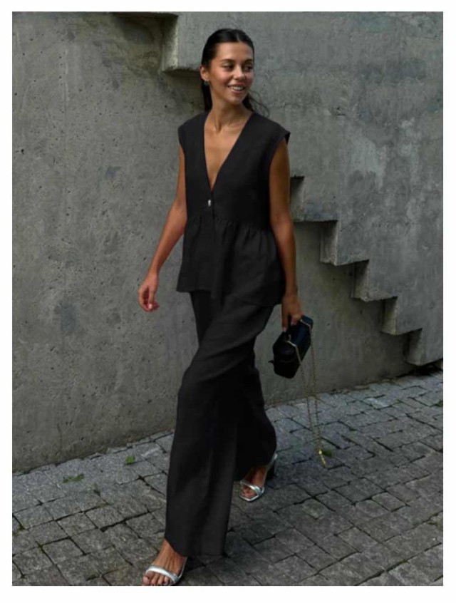 | 暑い季節のオフィススタイルに最適。 薄くて通気性抜群の生地、春夏の通勤やお出かけにおすすめ。 お腹・背中・腰まわりをきれいに隠しながら、深いVネックデザインで美デコルテを演出するペプラムセットアップ。 体のラインを拾い過ぎないルーズな仕上がりで着心地も抜群! そのまま着用するなら、セクシーで女性らしさを引き立てます。 インナーにボウタイブラウスなど合わせれば、きちんと感があり、華やかに。 | |