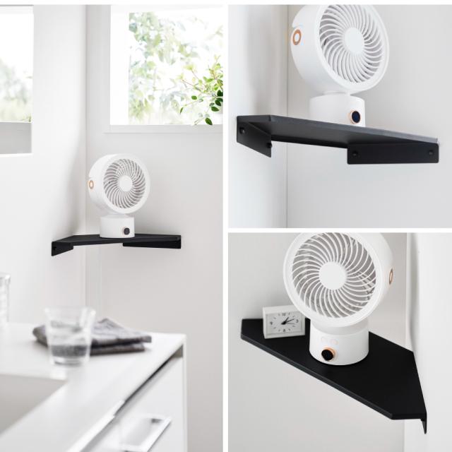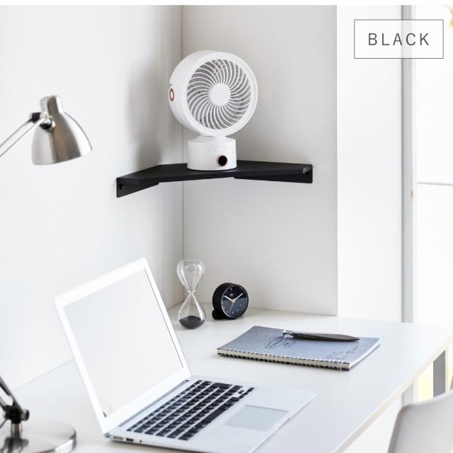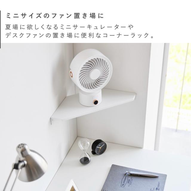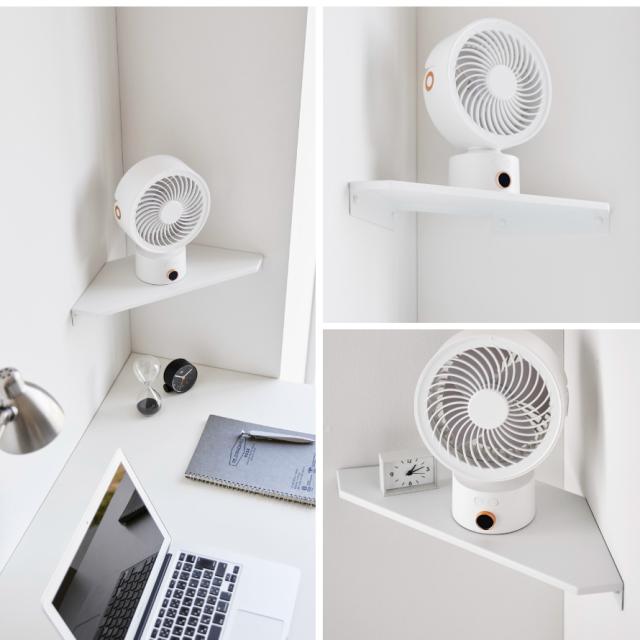 部屋のコーナーの壁に石こうボードピンで簡単に取り付けできるサーキュレーターラック。夏場に欲しくなるミニサーキュレーターやデスクファンの置き場に便利なコーナーラックです。
