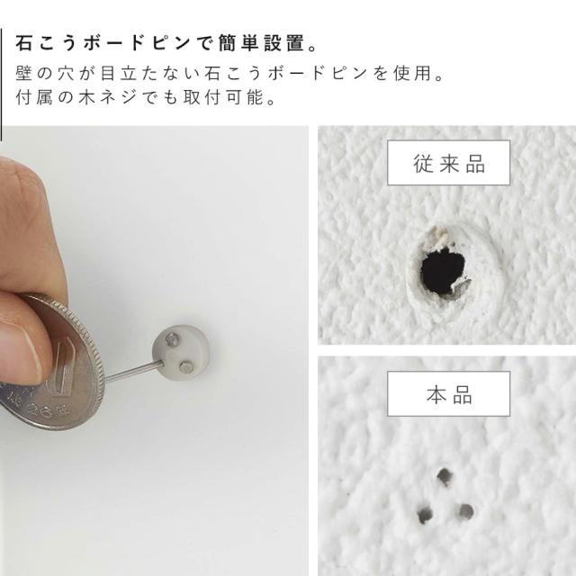 ■取り付け可能な壁面:石こうボードピン使用時/壁紙・布壁紙・ビニール壁紙貼りなどの石こうボード、薄ベニヤ 木ネジ使用時/柱・板壁(厚さ1cm以上)・プリント合板(裏側に水平にサンがある場所)・裏に下地材(間柱)が入っている壁
