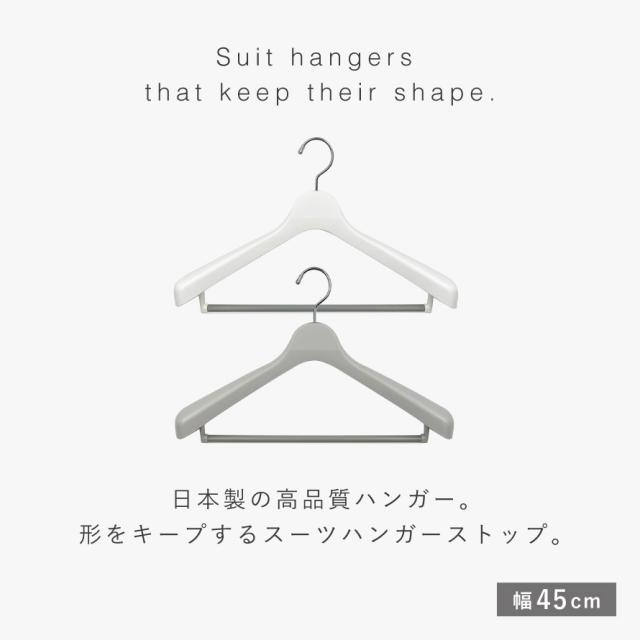 ハンガー屋さんのこだわりハンガー。日本製の高品質ハンガー「モノクローゼット」シリーズ。スーツの形をキープする「スーツハンガーストップ」。