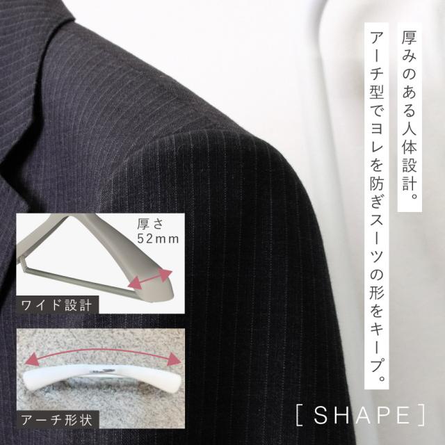 直線的なハンガーだと生地が引っ張られて、肩にポコッと跡がつくことがありますが、アーチ型はヨレを防ぎ、結果的にスーツの寿命も長くなります。