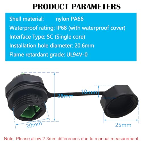 仕様: インターフェースタイプ:SC(シングルコア) ピン端面:APC インターフェースカラー: グリーン 防水リング:シリコン 防水レベル:IP68(防水カバー装着時) 難燃性レベル:UL94V-0 材質:PA66 使用温度:-40℃〜85℃ 取付穴:20.6mm 利点: 〇内部は標準的な金属部品で作られ、外殻は高品質のナイロンPA66素材で作られてお