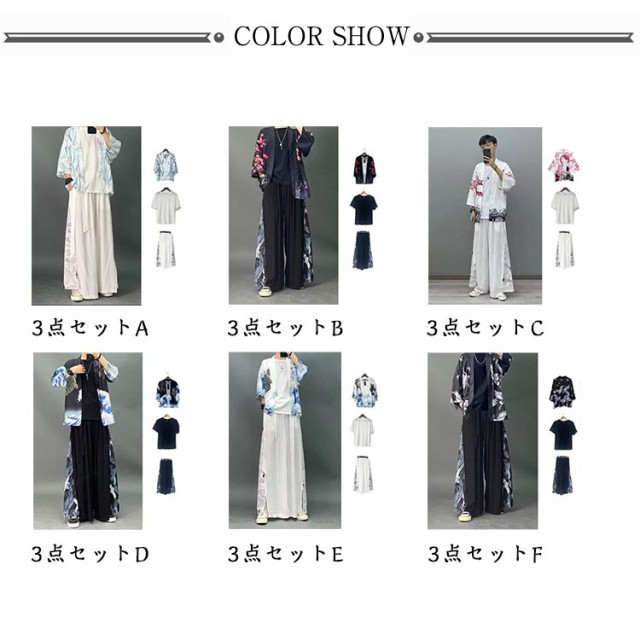 3点セット 羽織り 上下セット カーディガン 和柄 3点セット 袴パンツ メンズ スカート風 じんぺい スカーチョ セットアップ ワイドパンツ 浴衣 甚平 ハカマパンツ ゆったり フレアパンツ お兄系 ホスト ヴィジュアル系 袴 無地 モード系 個性派 ダンス 衣装
