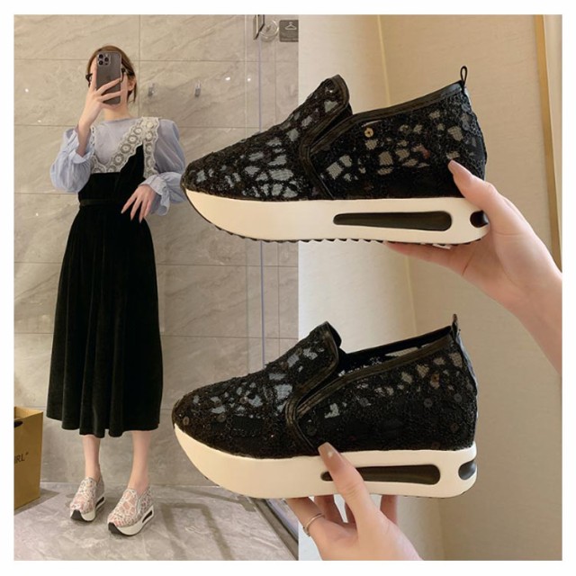 インヒールスニーカー スニーカー プラットフォームスニーカー レディース 靴 スリッポン レース フラット 黒 透け感 大きいサイズ シューズ 厚底 インヒール2cm ヒール3cm ローカット 春 厚底スニーカー 結婚式 和装 シースルー 花柄