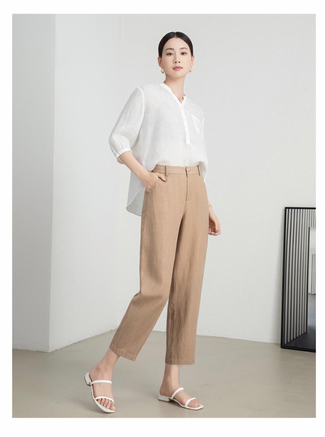 | クロップド丈で足首が見えるすっきり着丈なので女性らしく抜け感もある大人っぽいアイテムです お仕事コーデに必須のすっきりテーパードパンツ。 少しゆとりのあるフィットを裾にかけてテーパードさせ、クロップド丈にすることで全体的にはスッキリと見える様にしています。 フロントはボタンとファスナー開きできちんと感があります。 ウエストは後ゴム入りなので、すっきり見せるのに着心地は快適。 綿と麻素材なので、涼しげな印象をプラス。 大人の余裕を感じさせるきれいめパンツとしておでかけからオフィスまで幅広く大活躍♪ | |