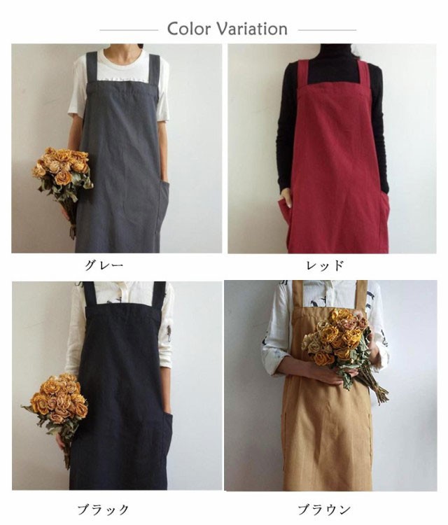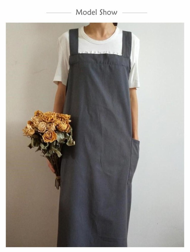 | シンプルで実用的な綿麻素材のクロスエプロン。 スポッとかぶるだけで着られて、着丈長めなのでワンピースみたいに使えます。 薄すぎず厚すぎず通気性よく綿麻素材で、通年使えそうです。 ポケットが横についているので、屈んだときに入れたものを落とさずにすみます。 太めの肩紐&バッククロスのデザインで、肩への圧迫が減ります。 | |