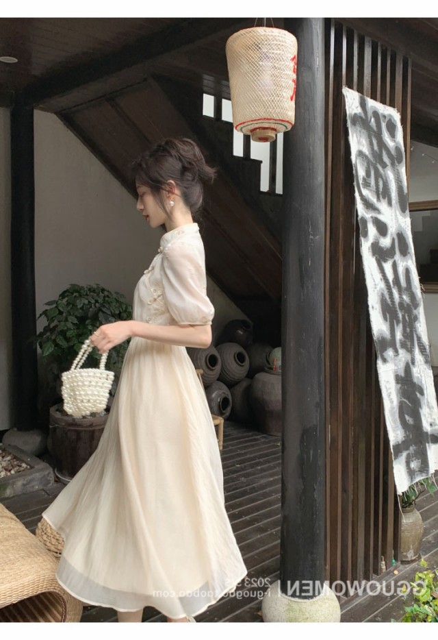 白ワンピース レディース 夏 チャイナ風 レトロ aライン シフォン スタンドカラー ロング丈 パフスリーブ 着?せ かわいい リゾート きれいめ おしゃれ カジュアル
