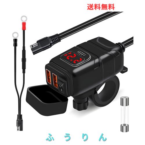 バイクUSB電源 バイク用 USB 防水 急速充電 【2USBポート出力 電源スイッチ 電圧計】SAE ニューズ 多重保護 DC12V-24V バイク 大型バイク