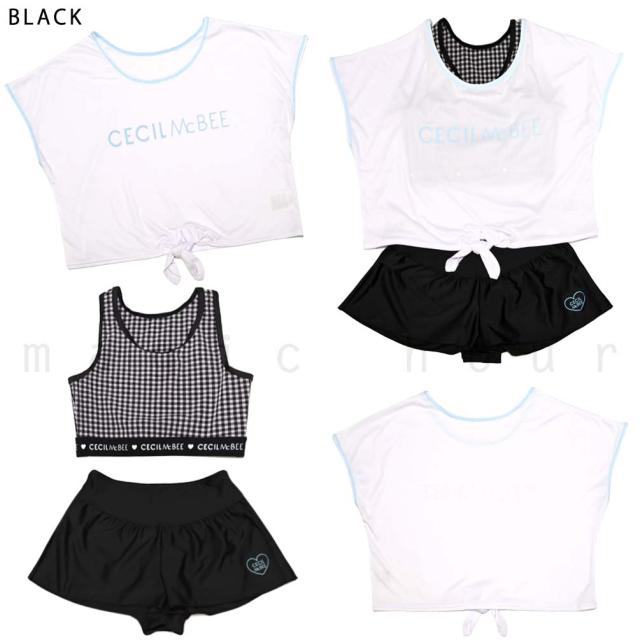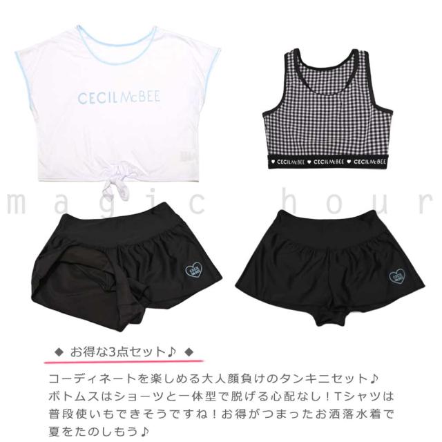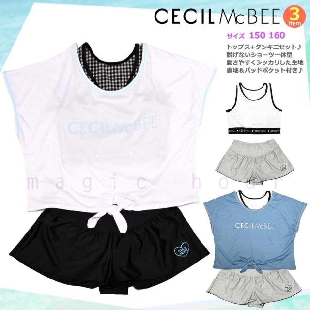 ガールズ 水着 女の子 タンキニ セパレート スイムウェア 3点 セット セシルマクビー T付き 子供 ジュニア ブランド お洒落 140 150 160 cm 白 黒 ブルー グレー
