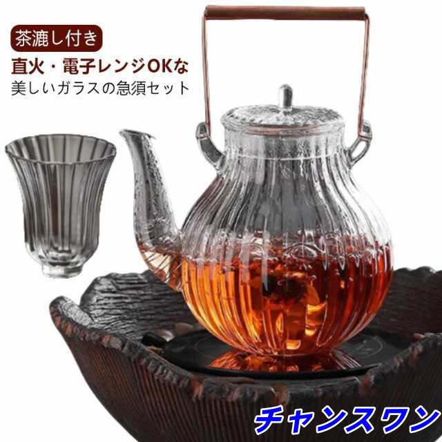 | 茶漉し付き 直火・電子レンジOKな美しいガラスの急須セット (ティーポット*1個+ティーカツプ*2個) ■着脱が簡単なステンレス製金針式茶漉し付き 茶葉の持つ香りと味を十分に引き出す設計 丸型の形状に、茶漉しは注ぎ口に挿入するワイヤー式のため、茶葉がジャンピングしやすくなっています。 ■透明度が高く、ポットの中の様子が見えるため、緑茶、紅茶、ハーブティー、お花のお茶、フルーツティー…などなど、いろんなお茶を見て愉しむこともできます。 また、把手は銅製なので使い込んでいくと味わい深く変化していきます。 400度まで耐えることができますが、弱火をおススメ。ただし耐熱温度以下であっても、温度差が大きい場合には割れが発生する可能性もありますので、注意が必要です 食器洗浄※・乾燥機OK 耐熱ガラスなのでキャンドルウォーマーや電子レンジで使えます。 本体のみ電子レンジ使用可 電子レンジでのご使用の注意 ※電子レンジで使用する際は茶こしを外して下さい。 ※空の状態で使用しないで下さい。 ※突然一気に煮沸して激しく吹き出す恐れがあります。 ※電子レンジから本体を取り出す際は鍋つかみ等を使用し、顔などを近づけないで下さい。 ※電子レンジご使用後は鍋敷き等の上に置いて下さい。 ※電子レンジをご使用前は、本体の水滴を拭き取って下さい。 | |