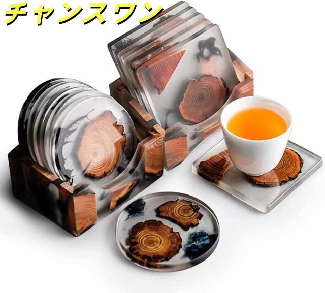 木製コースター レジン断熱パッド コップ敷き6枚セット 収納ケースが付き スター 円形 四角形 芸術品 アンティーク 上品感 可愛い オシャレ手作り 厚め 防水 滑り止め 装飾 無塗装 工芸品 /カフェ/来客用