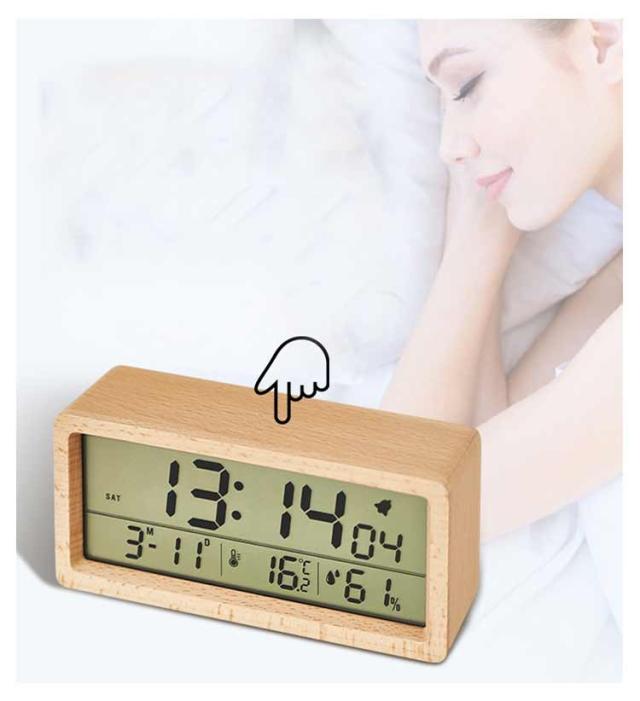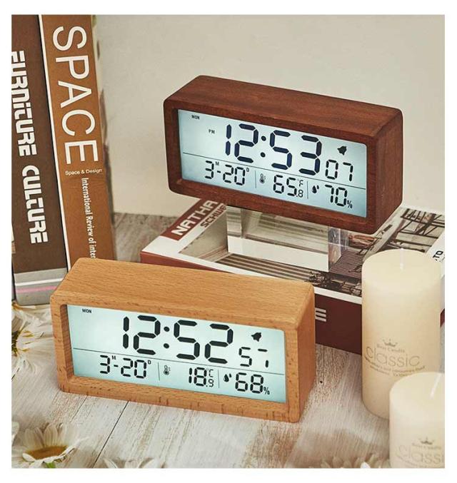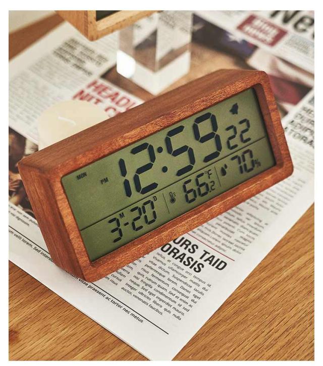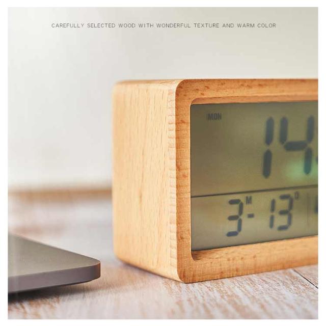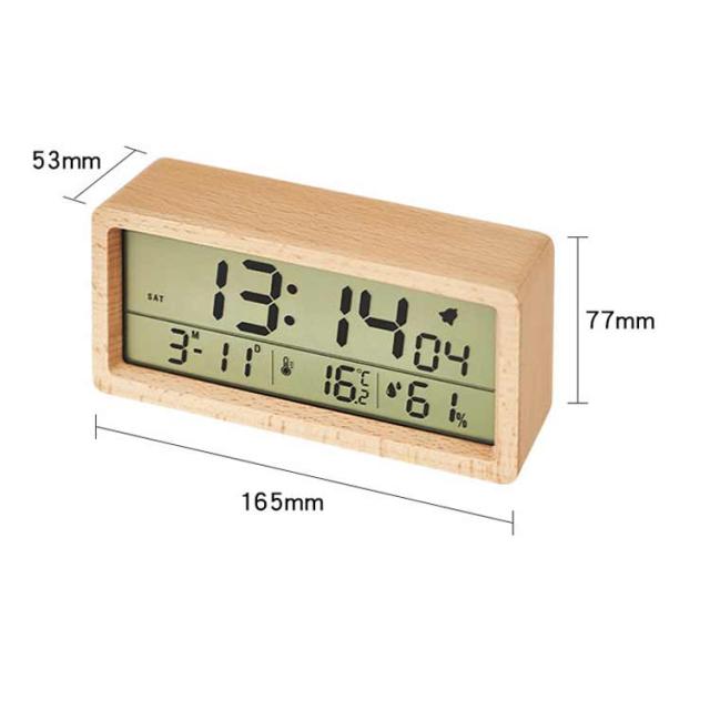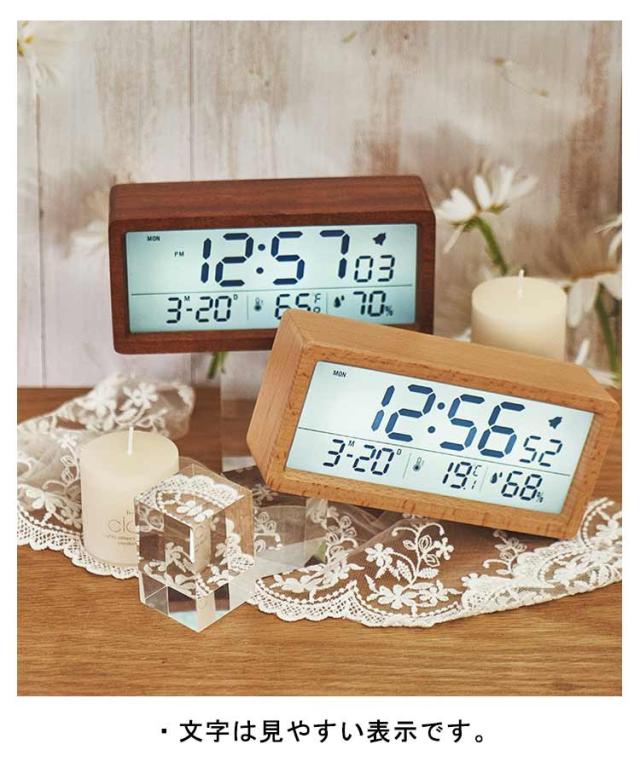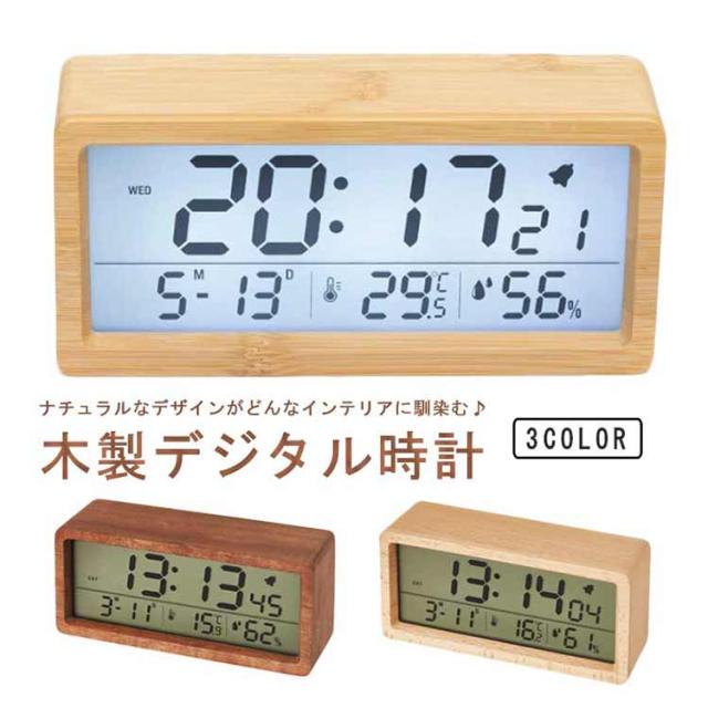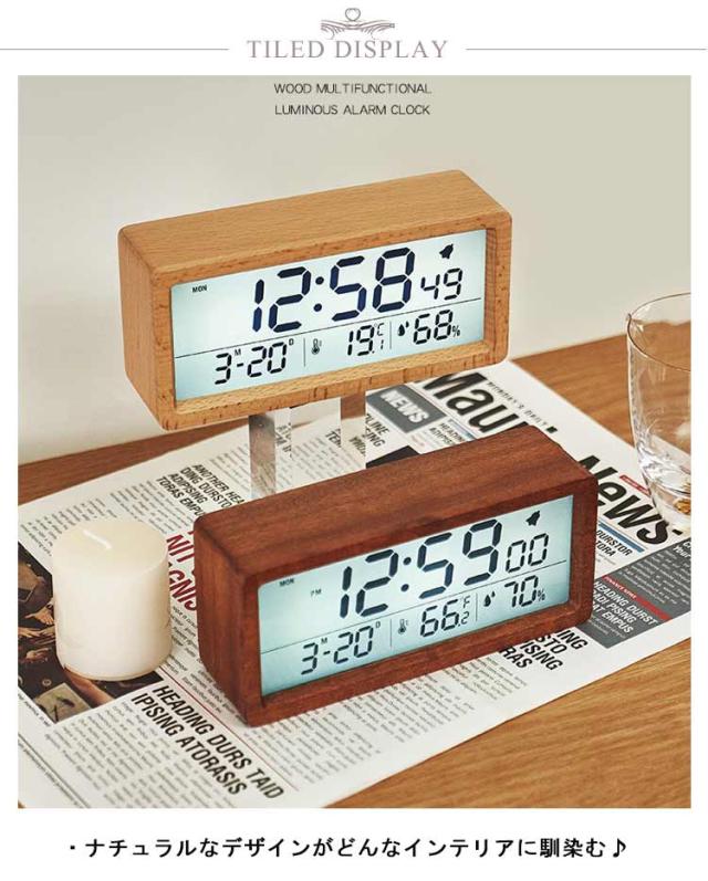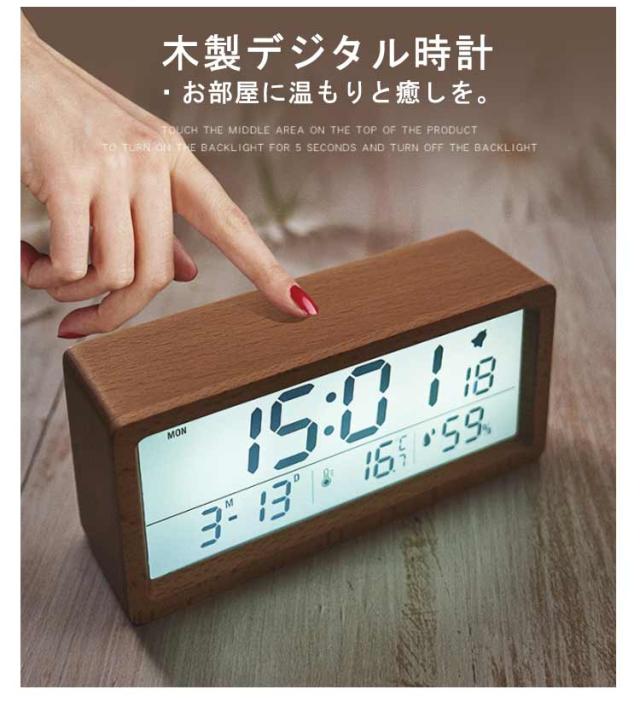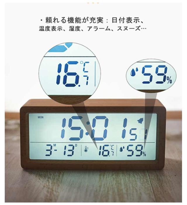 デジタル置き時計 卓上 目覚まし 木製 見やすい 数字表示 LCD 夜光 温度表示 日付 カレンダー 湿度 電池式 アラーム 目覚まし時計 持ち運び リビング ナチュラル シンプル インテリア