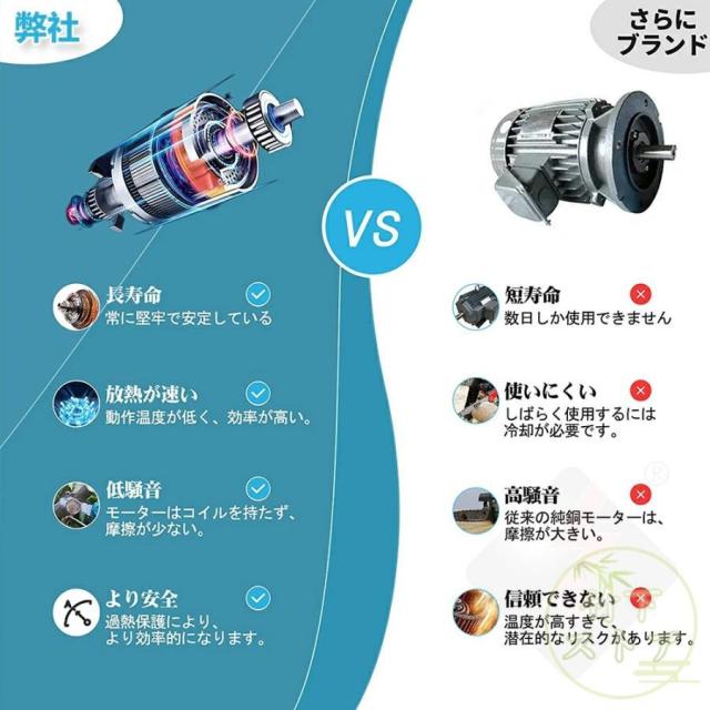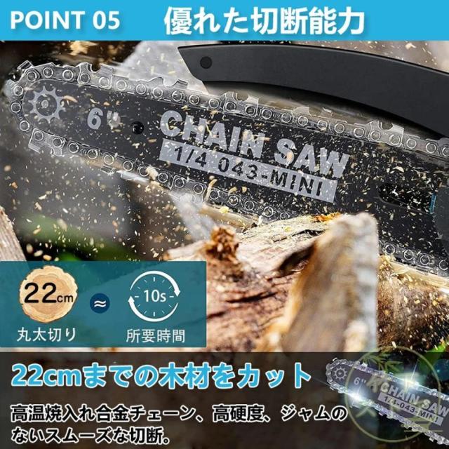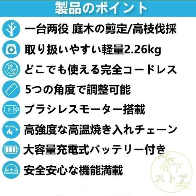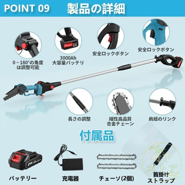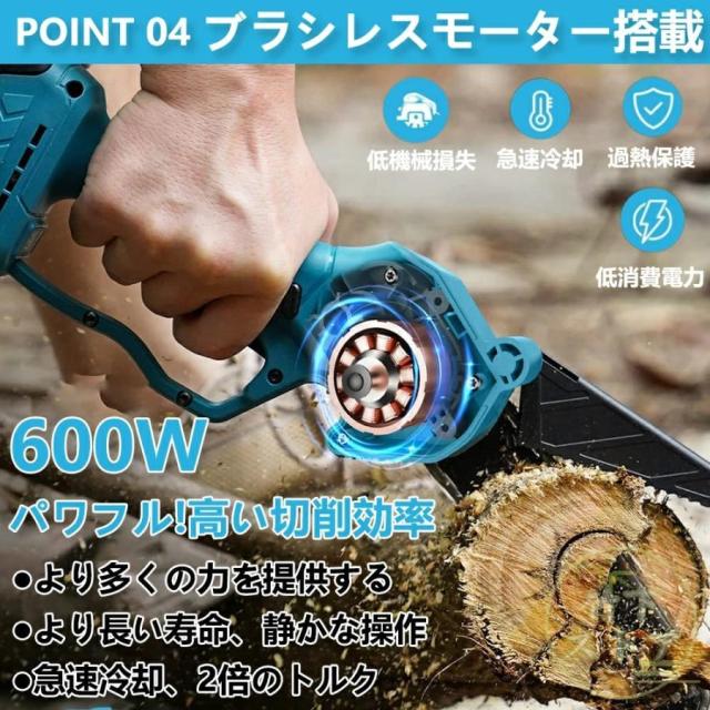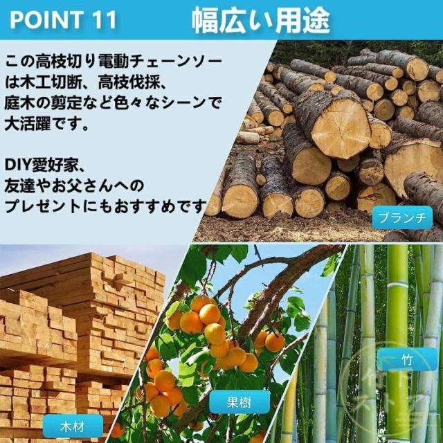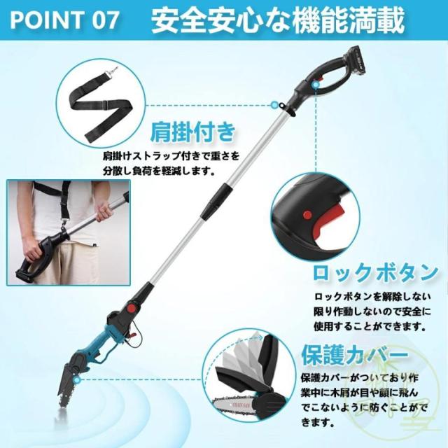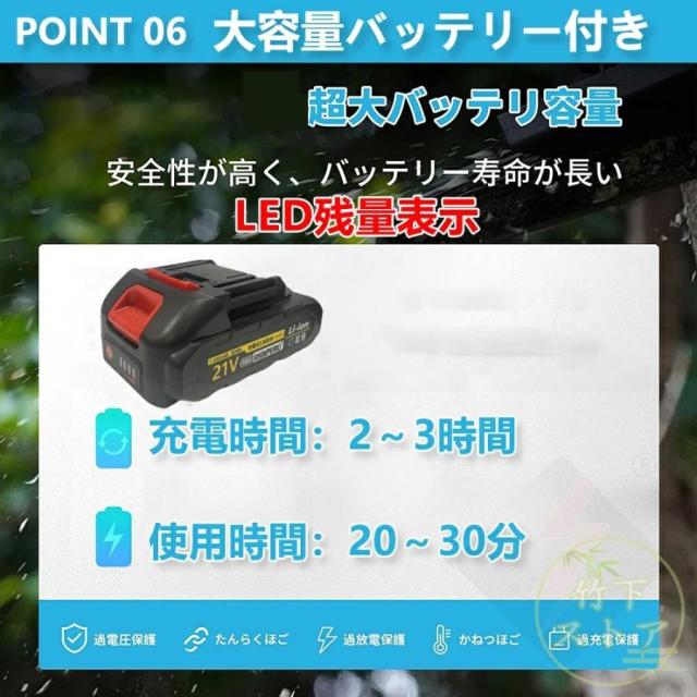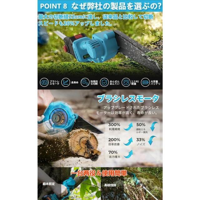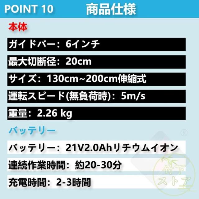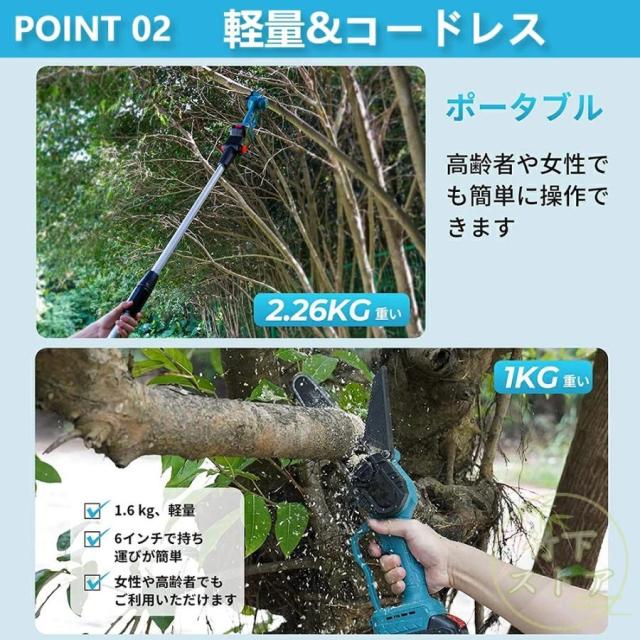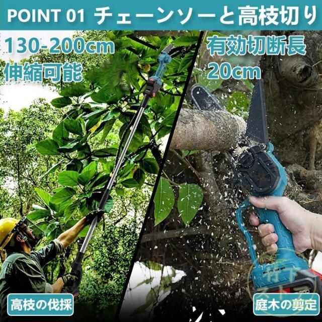 ゴムハンドル、滑り止め吸汗;遮断板の設計を広げ、切断時に木屑が飛び散るのを防止する。放熱孔設計、高効率通風放熱。総重量はわずか3.3 KG程度で、コンパクトで操作が便利で、片手で操作するのも楽です。【2 in 1高枝切ミニ電動チェーンソー組み合わせ】ミニチェーンソーと高枝切り電動チェーンソーを自由に切り替えて、さまざまな作業に対応。 伸縮ポールは無段階で110cm?150cmまで伸ばすことができます。 最大190cmの長さで、不安定なはしごに頼る必要はありません。 作業をより安全かつ効率的にします。 回転ボタンにより、ロッドを希望の長さにすばやく固定できます。 ヘッド部分は5段階(30?0?30?60?90度)の角度調整ができるので、枝切りもラクラク。【切り味抜群&2000mAhバッテリー1個搭載】1個大容量バッテリー搭載?マキタの18Vバッテリー通用: この充電式ちぇーんそーは1個取外し可能なバッテリーを搭載して、作業中簡単に交換できます。電源コードを接続せずに充電して使用できるため、使用場所を選らず、作業中に線を切る心配もありません。それに、マキタ18Vバッテリーとの交換性もあります。【軽量&優れた操作性】重量わずか2.3kgの充電式チェーンソーは女性にも高齢者にも手早く木の枝が切れます。そして、肩に優しい、幅ひろのショルダーベルトにおかけて、重量配分が良くて、筋肉疲労の軽減に役立ちます。【6寸の電気のこぎり】最新の設計は大いに成功しました: 業界の最新の6寸の電気のこぎりの設計、切断速度は約5 m/sで、22cm以内の木材に簡単に使用することができます。【ブラシレス銅モータ】強力なパワー、アングルグラインダーで修正されたチェーンソーよりも安定した出力。燃えるのが簡単でないように、高い荷。【携帯設計】ゴムハンドル、滑り止め吸汗;遮断板の設計を広げ、切断時に木屑が飛び散るのを防止する。放熱孔設計、高効率通風放熱。総重量はわずか3.3 KG程度で、コンパクトで操作が便利で、片手で操作するのも楽です。【ブラシレスモーター】充電式電動チェーンソーはブラシレスモーターを採用し、ブラシ付き純銅モーターを使用した電動チェーンソーと比較して、寿命が300%増加し、出力電力が75%増加し、エネルギー消費量が50%削減されます. 硬い素材と強力なブラシレスモーターを備えた高枝切電動チェーンソーを選択して、目詰まりのない、低騒音、高効率の切断作業をお楽しみください。【使用範囲が広い】電気のこぎりの適用範囲が広く、果樹園の側枝切断、家庭用薪、竹切り、苗木切り、都市緑化、DIY木製品プロジェクトなどに広く応用されている。高い枝を切断したり、花園の木を切断したりするなど、家庭で使用するのにも適しています。