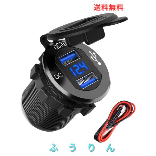 バイク用 チャージャー USB充電器 防水 QC 3.0 カーパワーソケット デュアル 2 ポート 36W 急速充電LED電圧計 12V / 24V 車/バイク/オー
