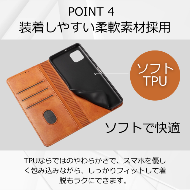 外側は高級感のあるPUレザー、内側は衝撃をやわらげるTPU素材を採用し、大切な端末をしっかり保護します。