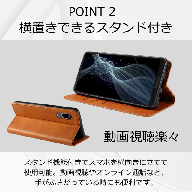 スタンド機能付きで横向きに安定して立てられます。動画視聴や資料確認にも便利な仕様で、日常使いに役立ちます。