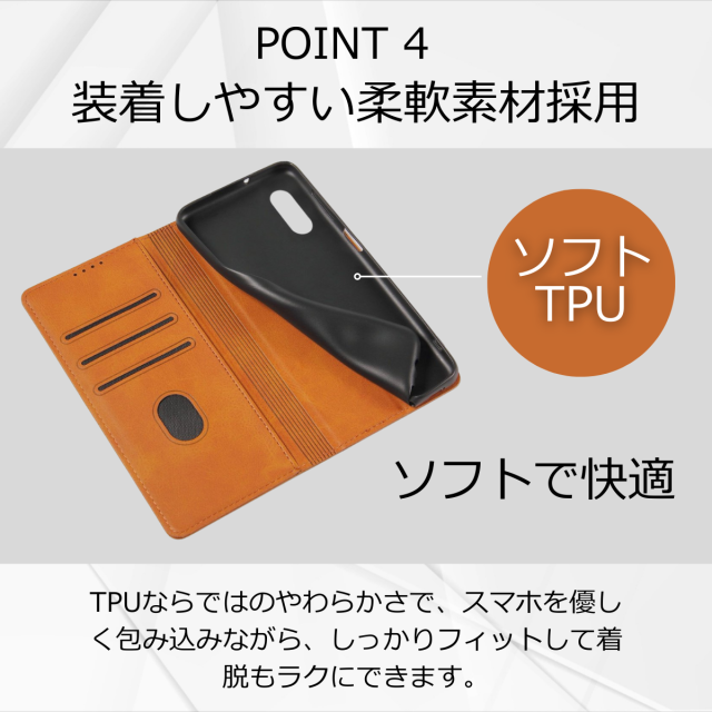 外側は高級感のあるPUレザー、内側は衝撃をやわらげるTPU素材を採用し、大切な端末をしっかり保護します。