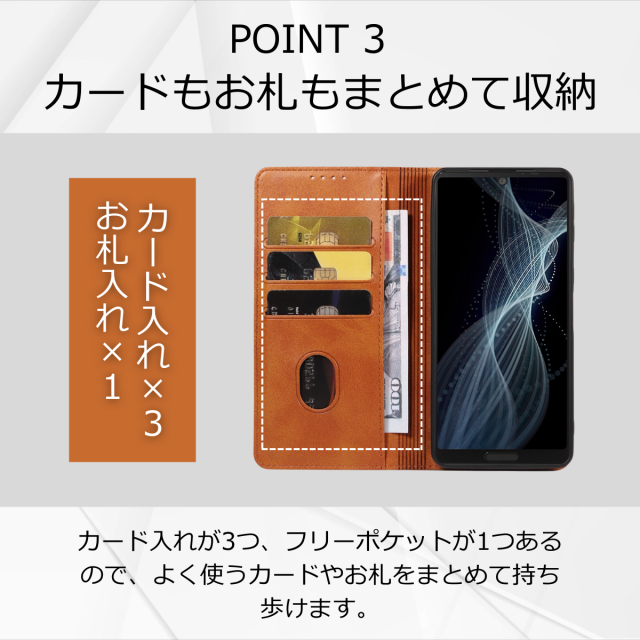 収納:カードポケット×3、紙幣やレシートが入るフリーポケット×1