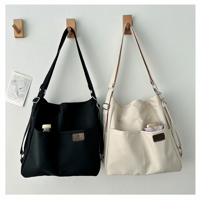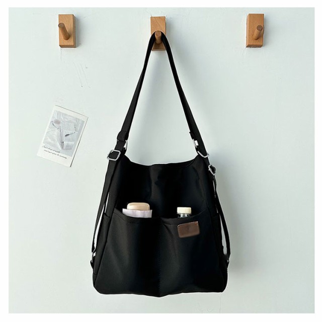 | 日常の必需品をまとめて収納できる大容量のショルダーバッグです。 ショルダーベルトの長さは調節可能で、リュック、ショルダーバッグ、斜め掛けバッグになります。 中央にファスナー付きがついているので貴重品なども安心です。 大きな開き口で、中身が見やすく、物が落ちる心配がありません。 撥水加工を施したナイロン素材なので、少しの雨ぐらいなら安心です。 両側のサイドポケットには口紅、鍵、イヤホンなどの小物を収納できます。 通学、通勤用はもちろん、ちょっとした旅行バッグとしても使えます。 | |