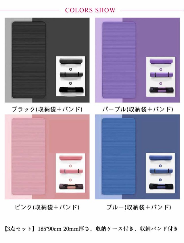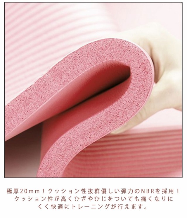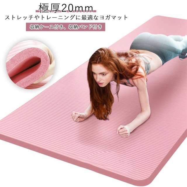 | ストレッチやトレーニングに最適なヨガマット。【極厚20mm】【収納ケース付き、収納バンド付き】 極厚20mm!クッション性抜群優しい弾力のNBRを採用!クッション性が高くひざやひじをついても痛くなりにくく快適にトレーニングが行えます。 汗や水分が染み込みにくい素材で濡れてもさっと拭けて清潔に使えます。 エンボス加工を施し表面が凸凹しているので、手足に張り付きにくくさらりとした使用感です。 約185cm×90cmのゆったりサイズなので様々なヨガのポーズや寝転がってのトレーニングにも対応! 厚みのあるマットによって床の保護や騒音を軽減してくれます。 持ち運びに便利なゴムバンド&収納袋付き!ゴムバンドがセットなのでヨガ教室にも持ち運び楽々!また軽量なので手軽に持ち出せます。 ヨガ教室での使用はもちろん!自宅でのヨガやピラティス、ストレッチ、リラックスタイムなど様々なトレーニングにも使えます。 | |