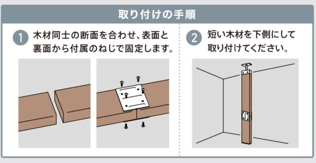 | 注意事項 | ※木材は別売りです ※この商品は2×4材・1×4材を使った突っ張り商品「2×4アジャスター」、「1×4アジャスター」の木材の長さが足りない場合に木材を接合するパーツです ※木材に反りや曲がりがあると正常に装着や設置ができない場合があります ※この商品は縦突っ張り専用です。横向きには使用しないでください ※2ヶ所以上接合しないでください ※商品ページ内には別の商品を含む画像を使用しています |