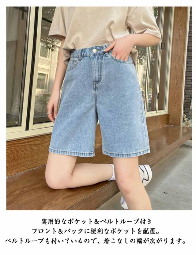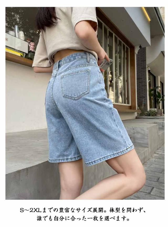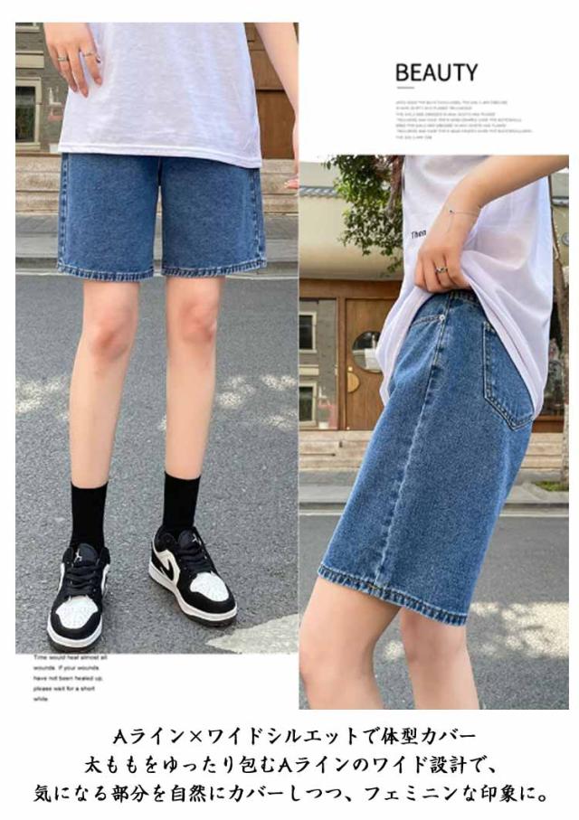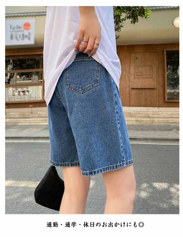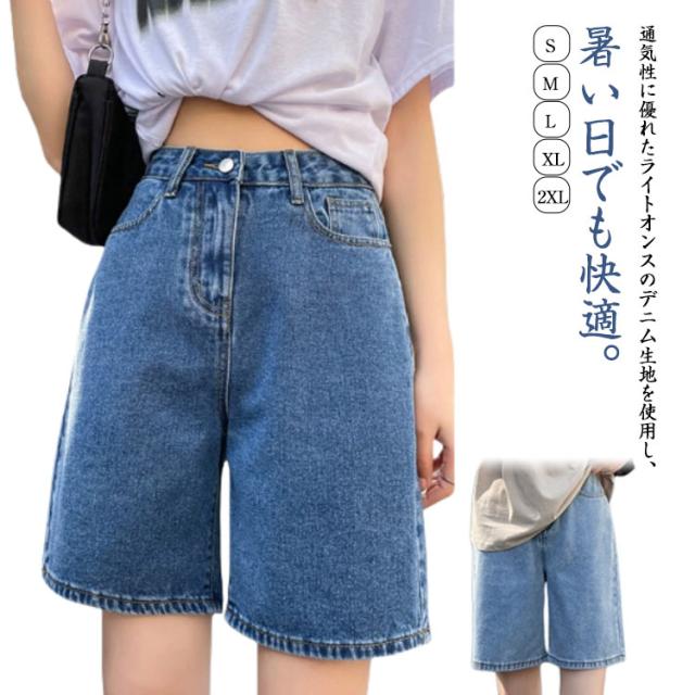 デニムパンツ ショートパンツ レディース ハイウエスト Aラインパンツ 五分丈 ゆったり ワイドパンツ ストレートパンツ 薄手 夏用 大きいサイズ ウエストゴム カジュアルパンツ 通勤 学生 おしゃれ シンプル ボトムス 無地 ポケット付き