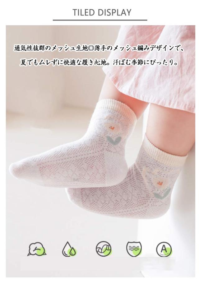| 通気性抜群のメッシュ生地◎薄手のメッシュ編みデザインで、夏でもムレずに快適な履き心地。汗ばむ季節にぴったり。 ふんわりとした柔らかな生地で、お子様の肌にも優しい。毎日の通園・通学にも◎。 抗菌加工済みの生地を使用し、汗をかいても臭いを抑えて清潔をキープ。 シンプル&可愛いデザイン。男女兼用のな色味で、どんなコーデにも合わせやすい。 洗い替えに便利な5足組セットで、兄弟姉妹でシェアするのもおすすめ。 【豊富なサイズ展開】小さなお子様から小学生まで対応、成長に合わせて選べます | |