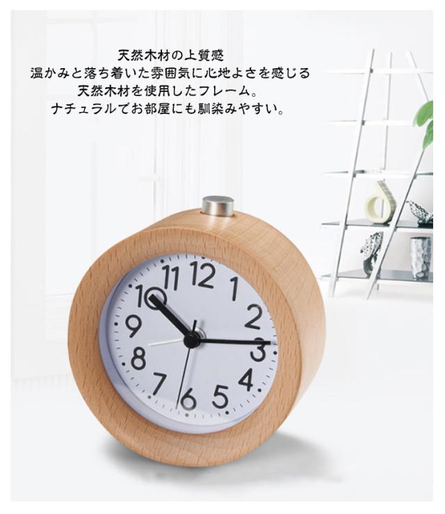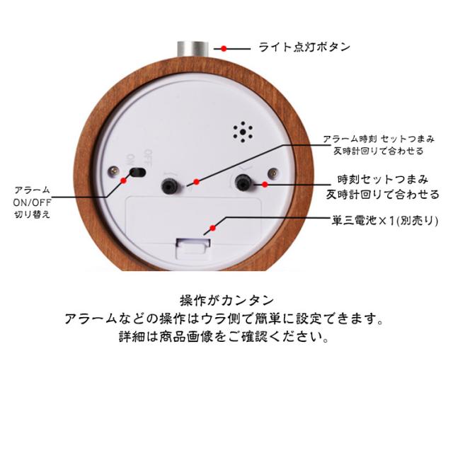 | 目覚まし時計 2色×3デザイン 天然木材 大音量 スヌーズ機能付き バックライト機能付き ■天然木材の上質感 温かみと落ち着いた雰囲気に心地よさを感じる天然木材を使用したフレーム。 ナチュラルでお部屋にも馴染みやすい。 ■静かな秒針 時計特有の気になるカチカチ音がしない静音設計。 勉強や就寝時に音を気にせず快適な時間を過ごせます。 ■バックライト機能 上部のボタンを押すとライトが点灯して文字盤を照らし、暗闇での時刻の確認に便利。 ■スヌーズ機能 約5分間隔でアラーム音が再度鳴るスヌーズ機能付きで二度寝を防止してくれます。 ■4段階アラーム 約5分間隔でアラーム音が再度鳴るスヌーズ機能付きで二度寝を防止してくれます。 4段階のリズミカルな音でしっかり音を届けます。音が徐々に大きくなっていくので快適に起床できます。 ■操作がカンタン アラームなどの操作はウラ側で簡単に設定できます。 詳細は商品画像をご確認ください。 | |