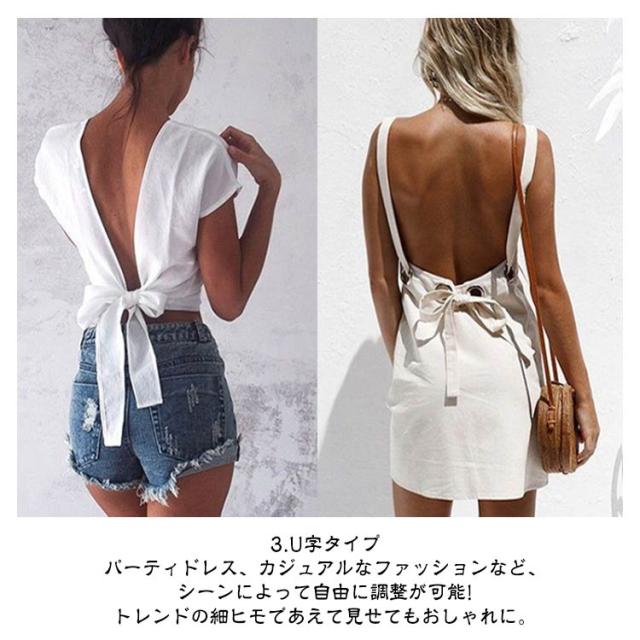 | 背中開き U字型ブラ S-XL 2タイプ×4色 背中が大きく開いた バッグオープンブラ 洋服に響かないデザイン バッグが開いた ドレスやトップスと相性バツグン! カップの裏がふんわり 薄手のコットン三角カップ。 盛りすぎずに自然な胸に。 生地がふんわりしており、 デリケートお肌にも安心! 肩ひも調節可能 調節アジャスター付き。 着脱が簡単で、自由自在に調節ができ、便利です。 1つで3つのバリエーション! 1.首紐タイプ 2.クロスタイプ 3.U字タイプ パーティドレス、カジュアルなファッションなど、シーンによって自由に調整が可能! トレンドの細ヒモであえて見せてもおしゃれに。 | |