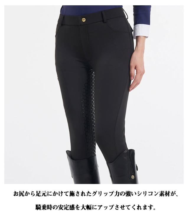 | 【男女兼用】【夏用】【薄手 速乾】 足首部は脱ぎ履きしやすいスパッツ素材となっています。 オールシーズンモデルです。 シリコン部位も含めて大変伸びが良く、快適な履き心地です。 お尻から足元にかけて施されたグリップ力の強いシリコン素材が、騎乗時の安定感を大幅にアップさせてくれます。 体にピッタリとフィットするような着用感ですが、高伸縮でストレッチのきいた柔らかい素材でできています。 | |