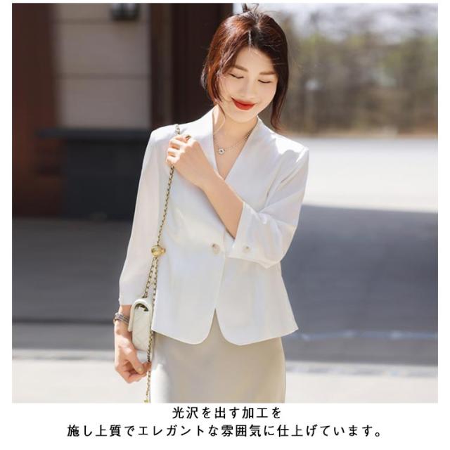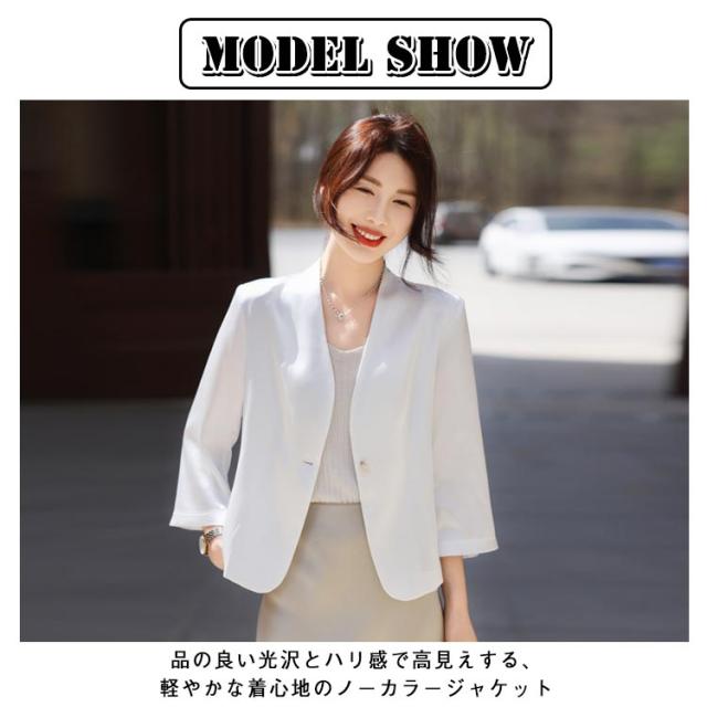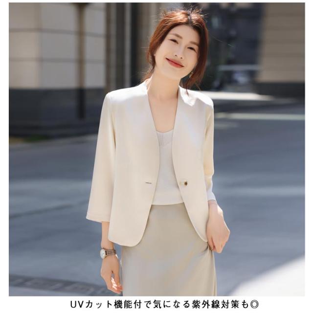 | 品の良い光沢とハリ感で高見えする、軽やかな着心地のノーカラージャケット 光沢を出す加工を施し上質でエレガントな雰囲気に仕上げています。 程よくコンパクトな着丈はトレンドのシルエット。 襟元はVネックにしているのでスッキリと見え、細めのボウタイブラウスなども綺麗に着用出来ます。 UVカット機能付で気になる紫外線対策も◎ シンプルなラインのジャケットですので、セレモニーシーンだけではなく、ブラウス等に合わせて着用していただくコーディネートにも優秀です。 (通勤・ビジネス・結婚式・参観日・卒業式など)幅広いファーマルなシーンに活躍するおすすめの1枚です。 | |