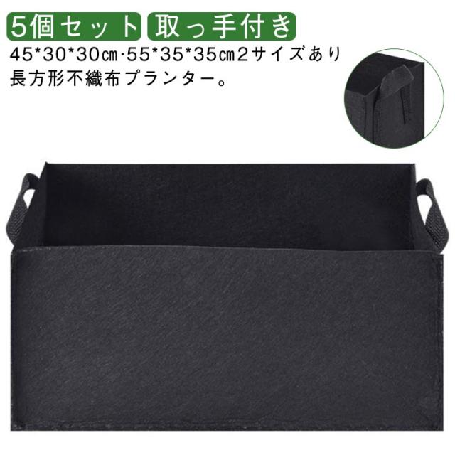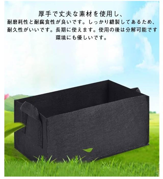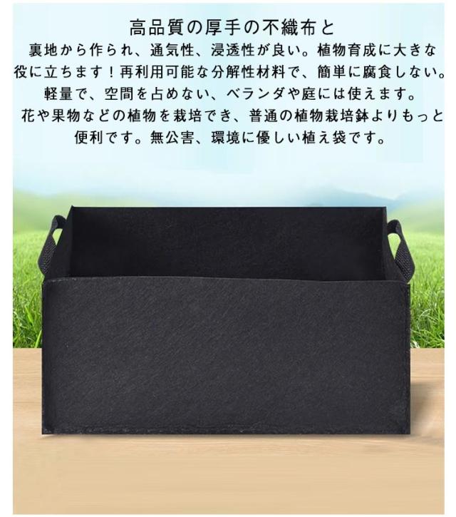 | 長方形不織布プランター。【45*30*30cm?55*35*35cm】2サイズあり【5個セット】【取っ手付き】 高品質の厚手の不織布と裏地から作られ、通気性、浸透性が良い。植物育成に大きな役に立ちます!再利用可能な分解性材料で、簡単に腐食しない。軽量で、空間を占めない、ベランダや庭には使えます。花や果物などの植物を栽培でき、普通の植物栽培鉢よりもっと便利です。無公害、環境に優しい植え袋です。 高品質の不織布を採用し、普通の植物栽培鉢より軽量です。人性化設計に従いました。もっと軽量で持ち手が付いてるので移動が楽です。使用しない時は収納できます。季節や気候に影響されない、全年間でも移植することができます。 厚手で丈夫な素材を使用し、耐磨耗性と耐腐食性が良いです。しっかり縫製してあるため、耐久性がいいです。長期に使えます。使用の後は分解可能です。環境にも優しいです。 不織布プランターで、陶磁器とプラスチックを作られた植物栽培鉢より、通気性と浸透性がもっと高いです。植物成長の空間が大きくて、水と栄養素が自然に浸透させ、植物の根の成長速度をコントロールできます。植物にとって、水分と栄養を吸収しやすいです。植物の生存率を改善できます。 | |