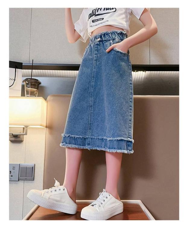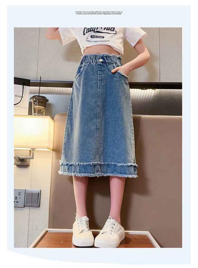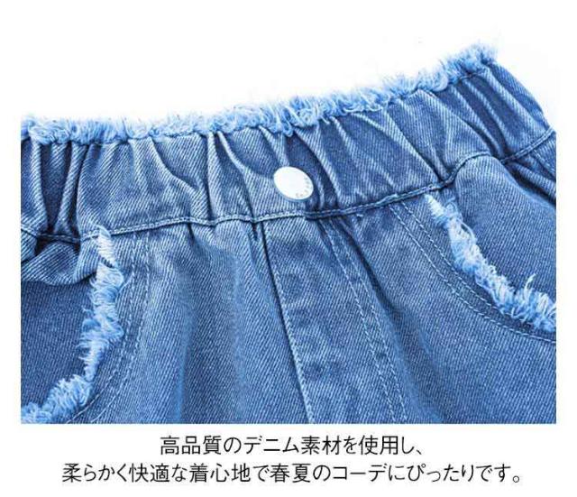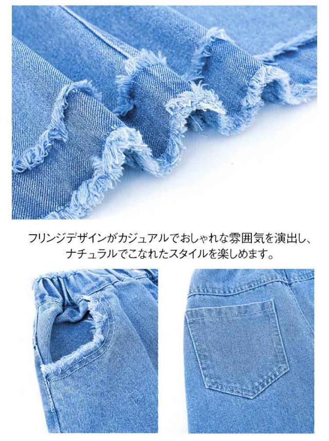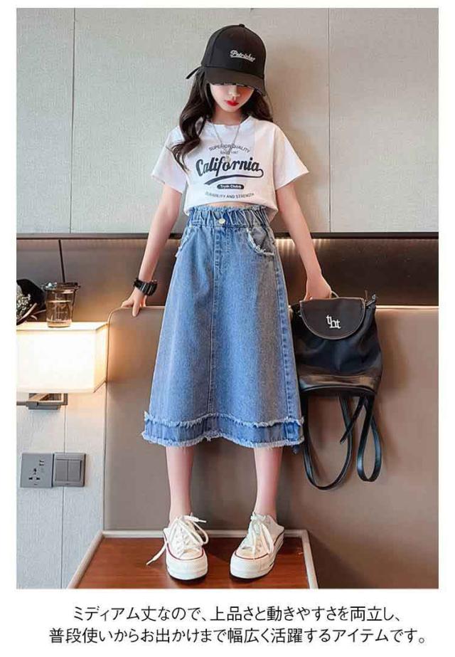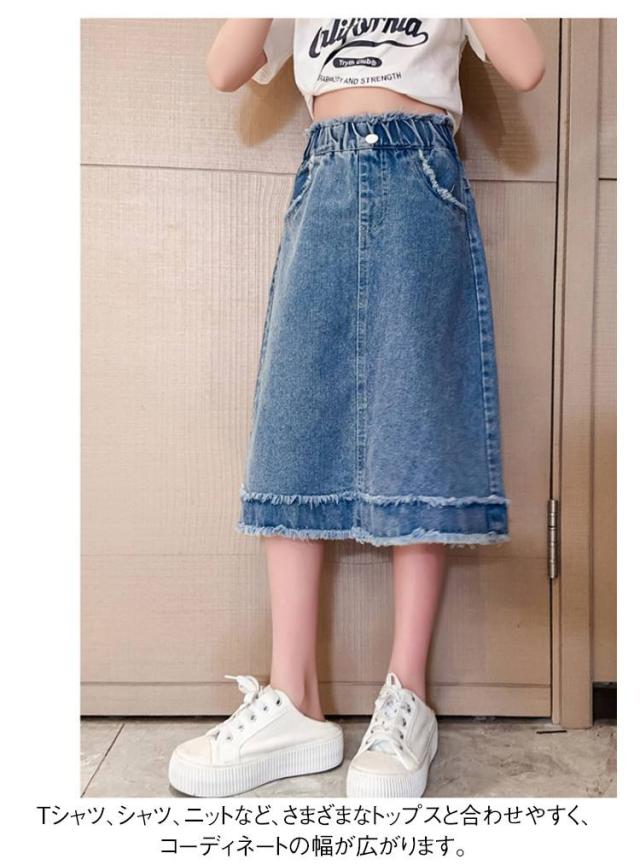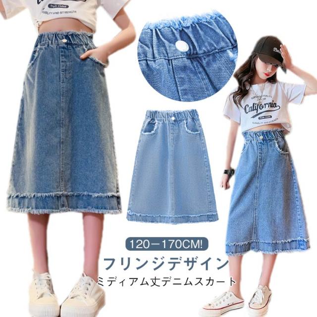 デニムスカート 春 キッズ ミディアムスカート ウエストゴム 150 フリンジ 夏 スカート ジュニアスカート ミディアム丈 子供スカート 秋 膝下丈 120 130 子供服 140 160 170