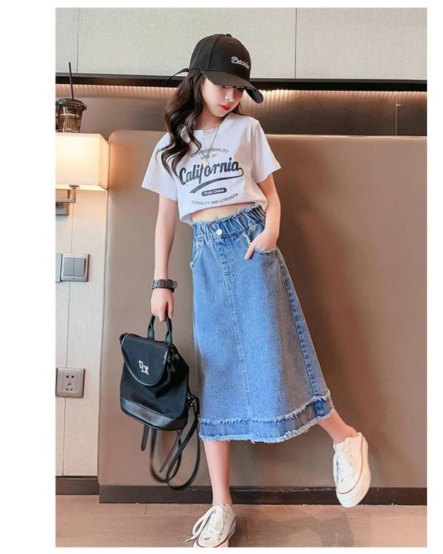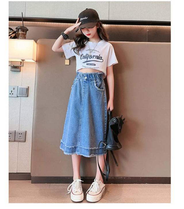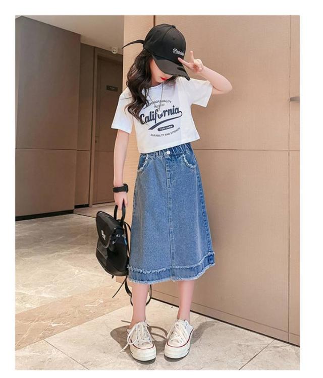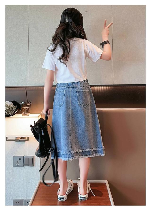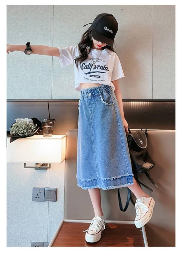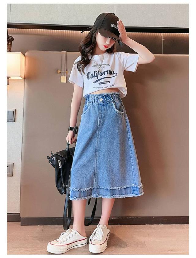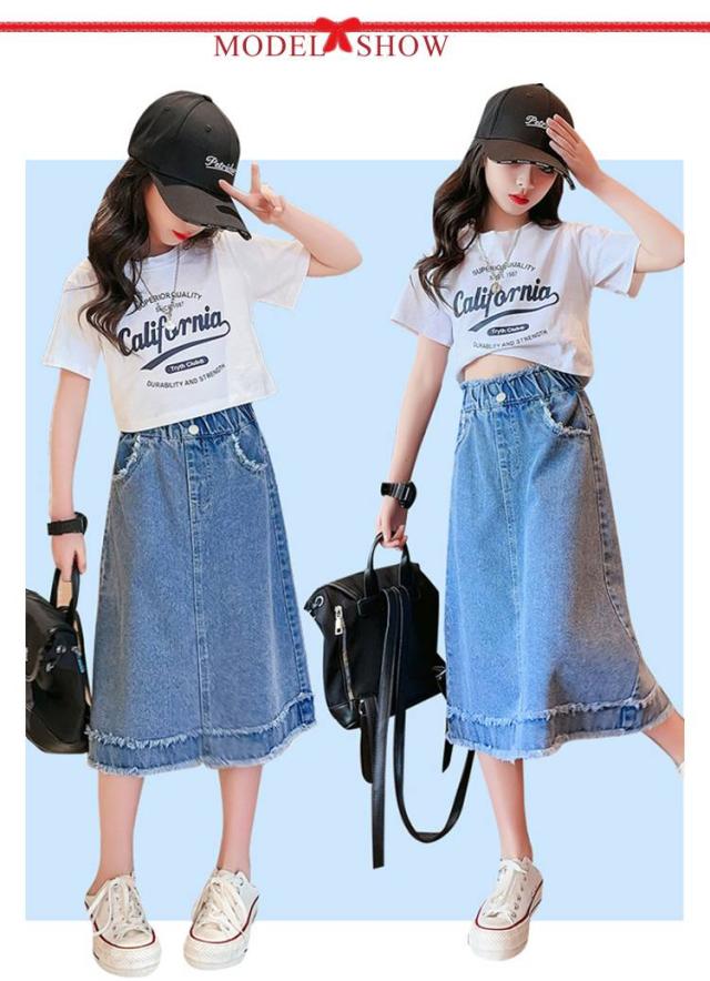 デニムスカート 春 キッズ ミディアムスカート ウエストゴム 150 フリンジ 夏 スカート ジュニアスカート ミディアム丈 子供スカート 秋 膝下丈 120 130 子供服 140 160 170