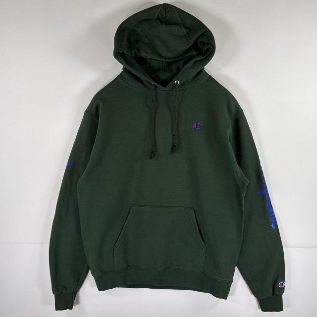古着 チャンピオン Champion パーカー スウェット プルオーバー ワンポイントロゴ 袖プリント フーディ M グリーン メンズ