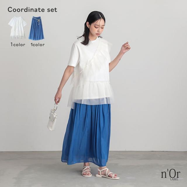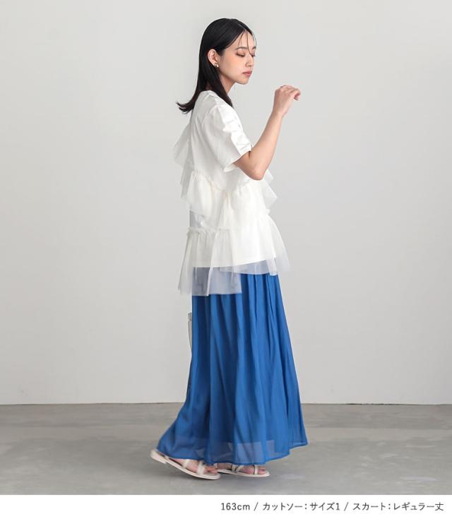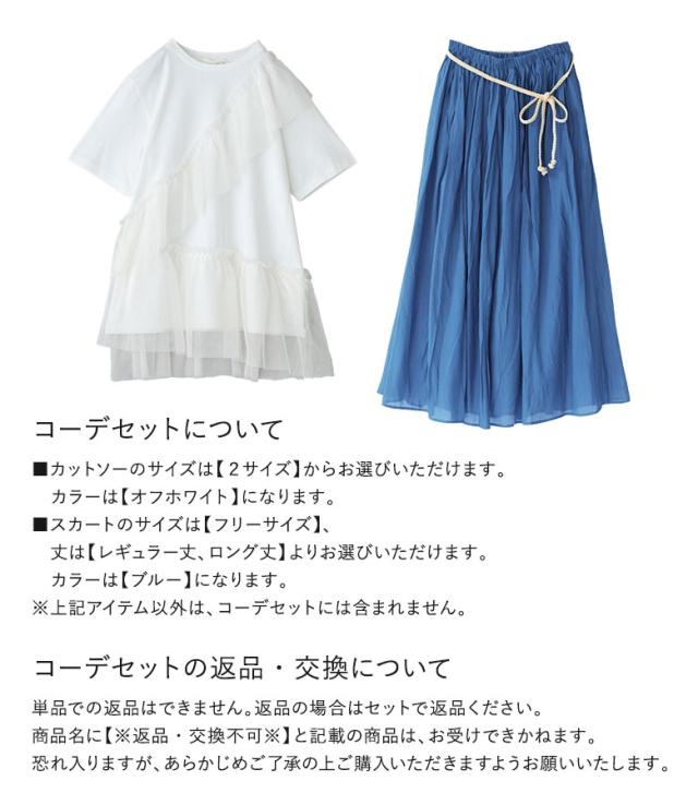 『冷感キープチュールフリルドッキングカットソー×ふわさらロングスカートコーデ2点SET』【メール便不可】【20】[2点コーデセット 2025 レディース カットソー Tシャツ 半袖 ボトムス スカート フレアスカート]