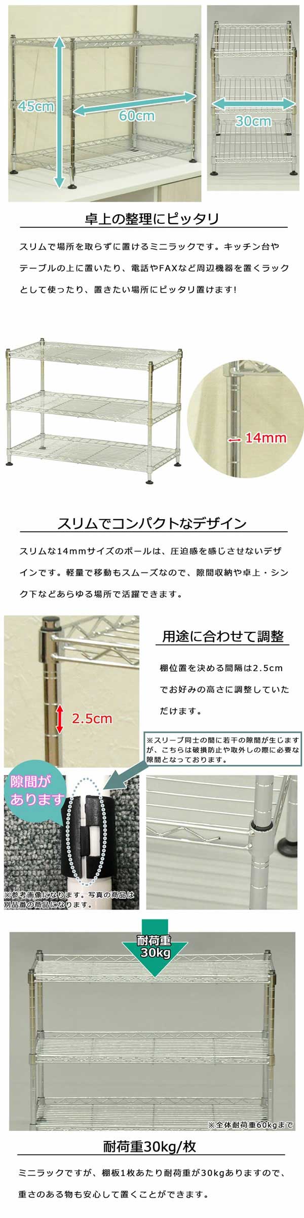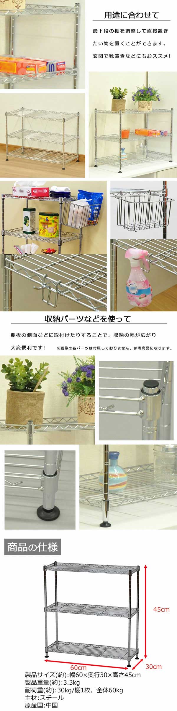 ・製品サイズ(約):幅60×奥行30×高さ45cm ・製品重量(約):3.3kg ・耐荷重(約):30kg/棚1枚、全体60kg ・主材:スチール(クロームメッキ仕上げ)、スリーブ(樹脂) ・生産国:中国 ・お客様組立品 ※モニターの発色具合により、実際の色と異なる場合がございます。 |